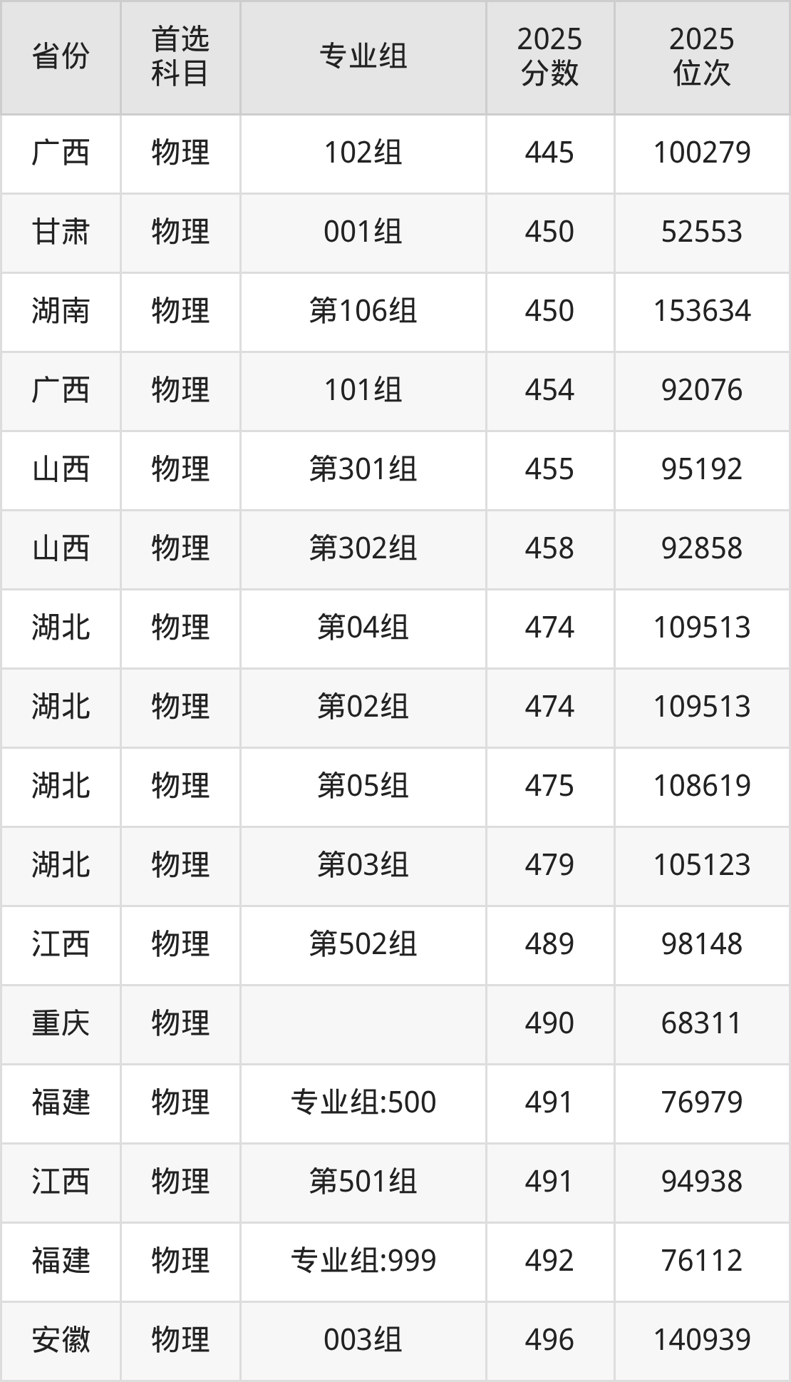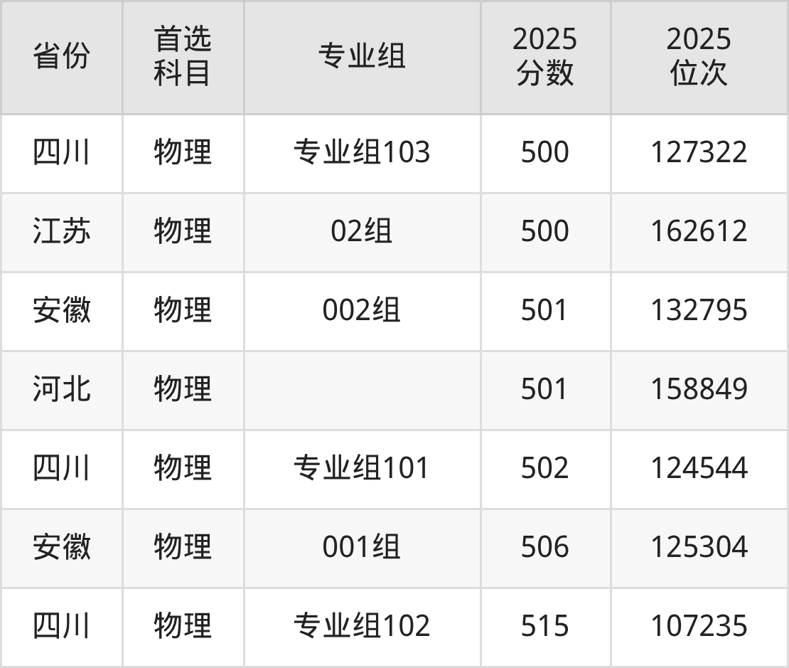物理类最低分对应地区为甘肃(002组),录取位次为73271,超本科线39分;最高分对应地区为四川(专业组102),录取位次为107235,超本科B77分。
