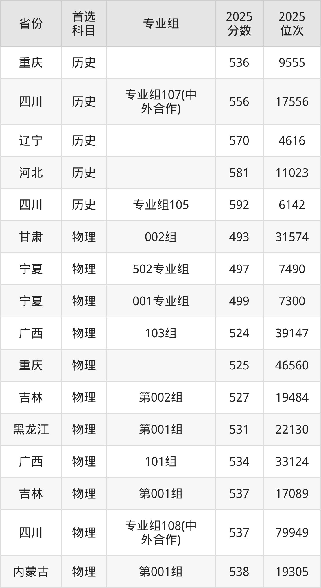 历史类最低分对应地区为重庆,录取位次为9555,超本科线98分;最高分对应地区为四川(专业组105),录取位次为6142,超本科B125分。