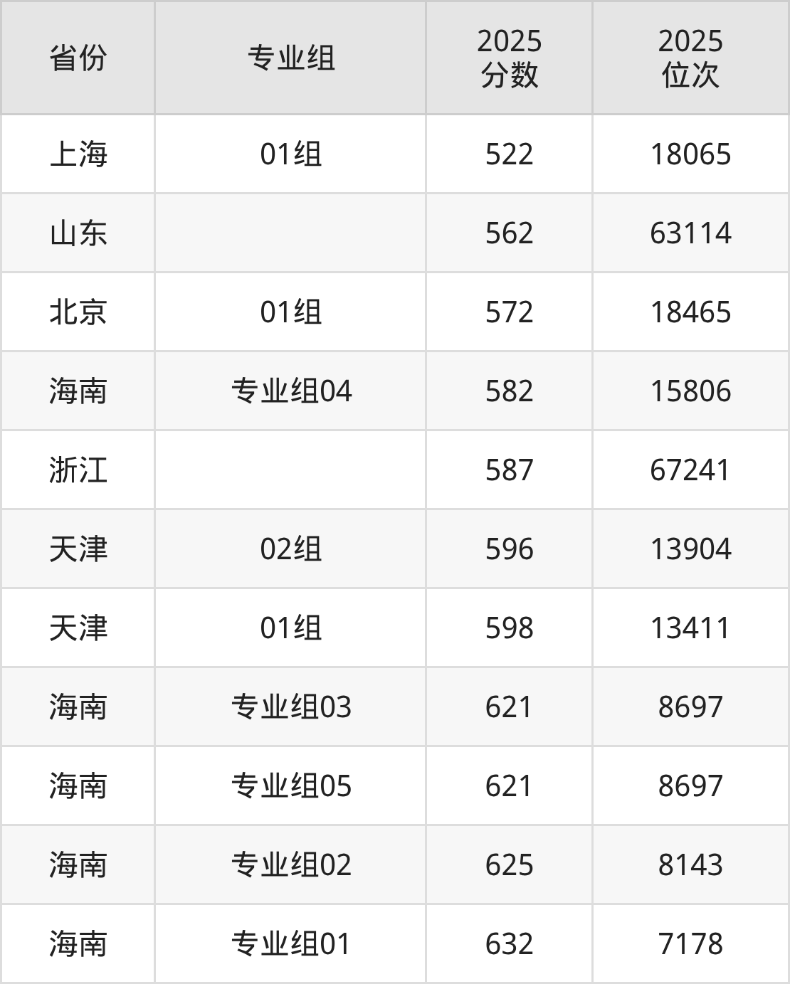 最低分对应地区为上海(01组),录取位次为18065;最高分对应地区为海南(专业组01),录取位次为7178,超本科线152分。