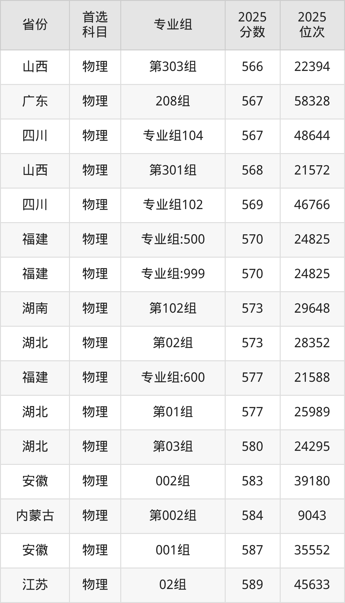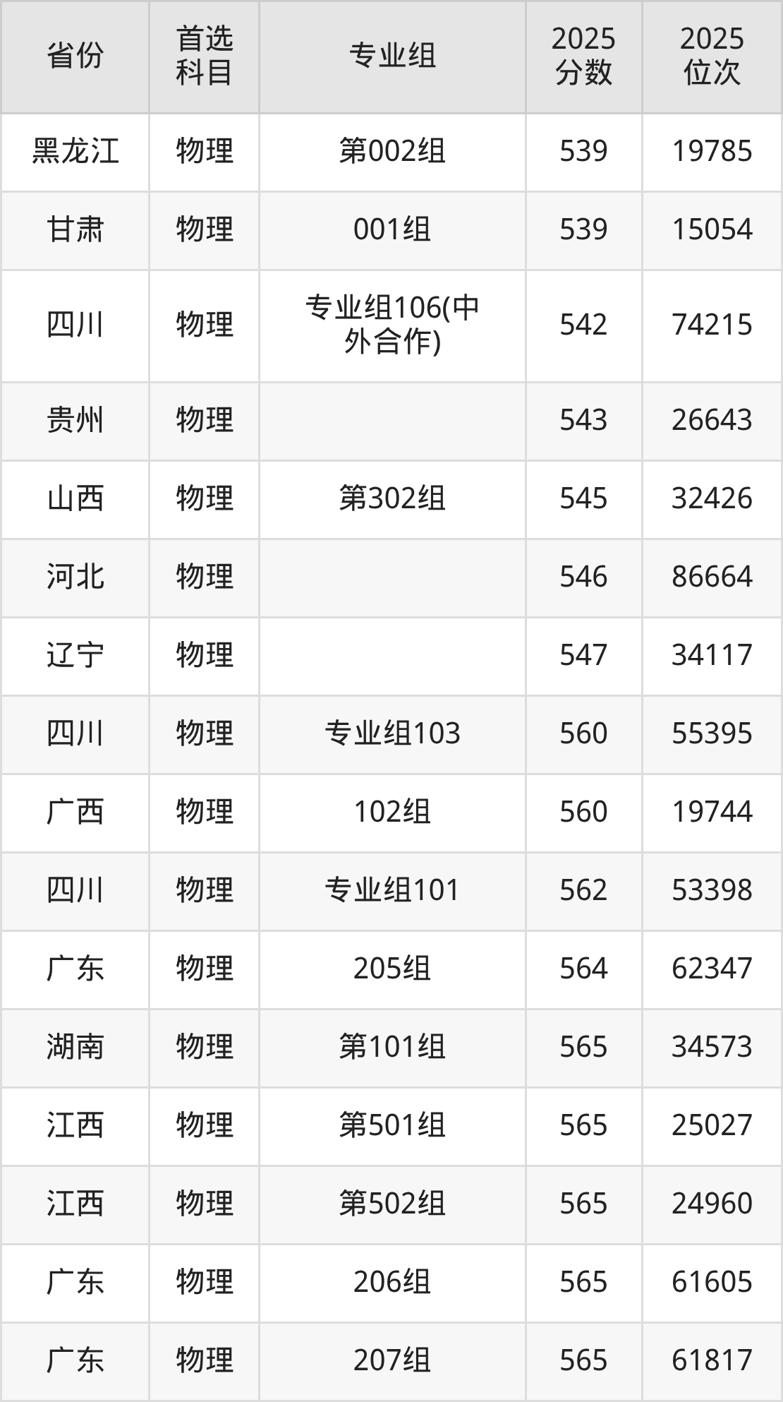物理类:专业组101562分、53398名,专业组102569分、46766名,专业组103560分、55395名,专业组104567分、48644名,专业组106(中外合作)542分、74215名,专业组108(中外合作)537分、79949名;