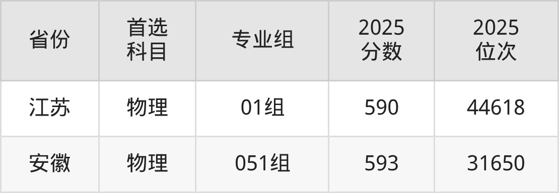 物理类最低分对应地区为甘肃(002组),录取位次为31574,超本科线119分;最高分对应地区为安徽(051组),录取位次为31650,超本科线132分。