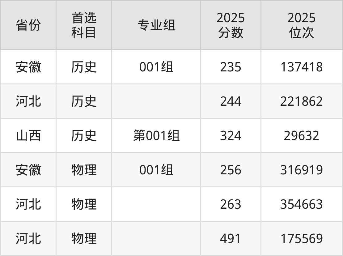 历史类最低分对应地区为安徽(001组),录取位次为137418,超专科线35分;最高分对应地区为山西(第001组),录取位次为29632,超专科线224分。