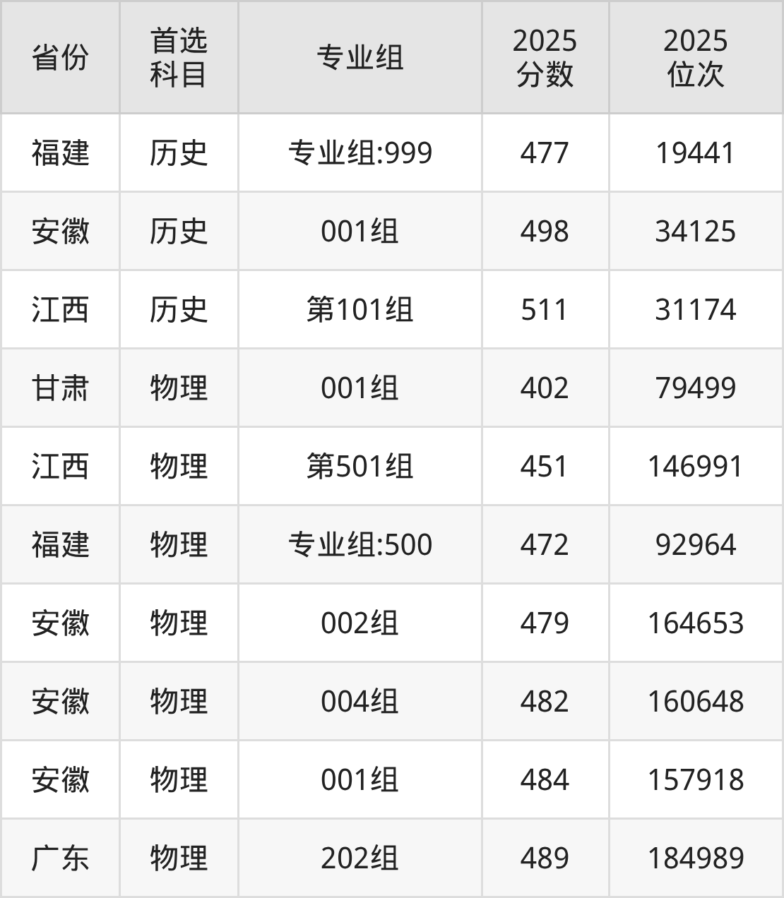 物理类最低分对应地区为甘肃(001组),录取位次为79499,超本科线28分;最高分对应地区为广东(202组),录取位次为184989,超本科线53分。
