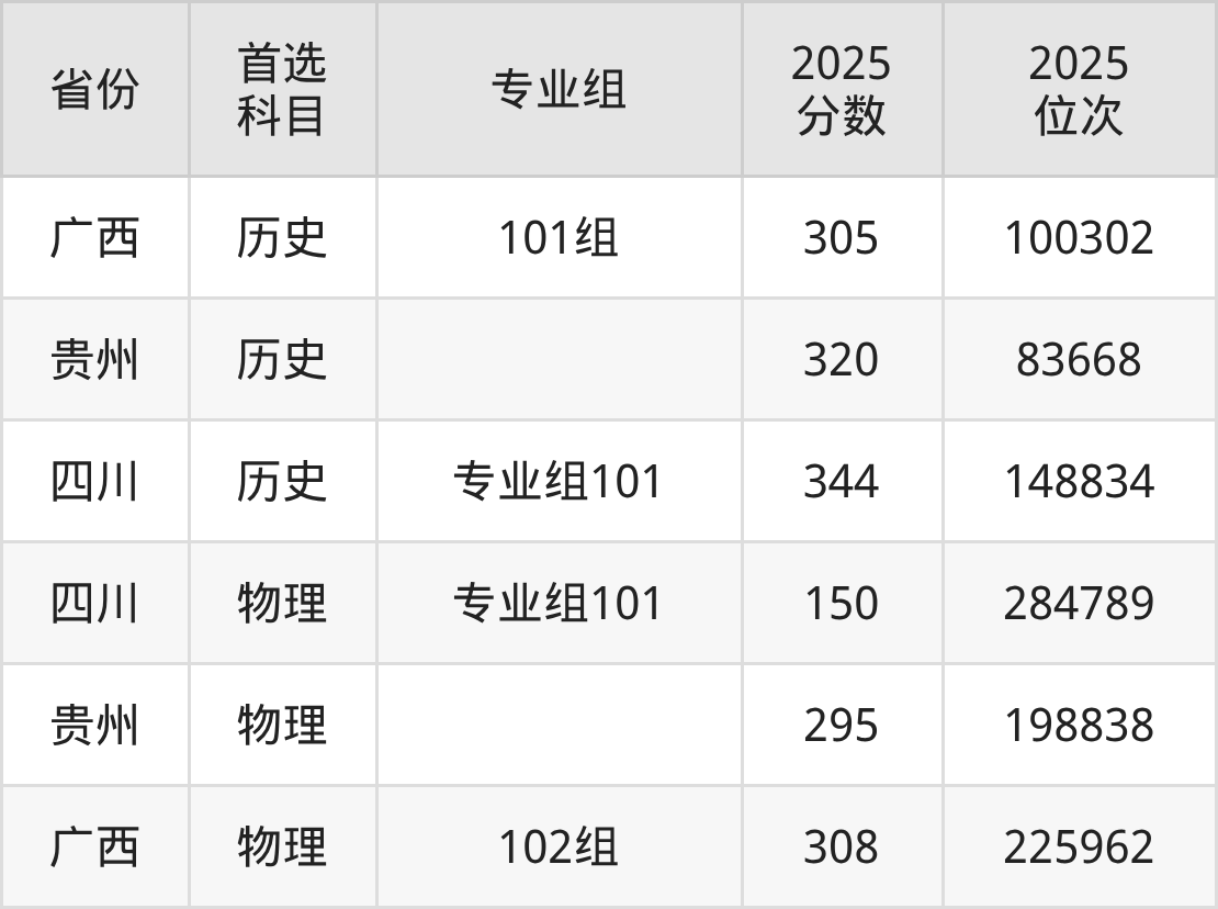 历史类最低分对应地区为广西(101组),录取位次为100302,超专科线105分;最高分对应地区为四川(专业组101),录取位次为148834,超专科线194分。