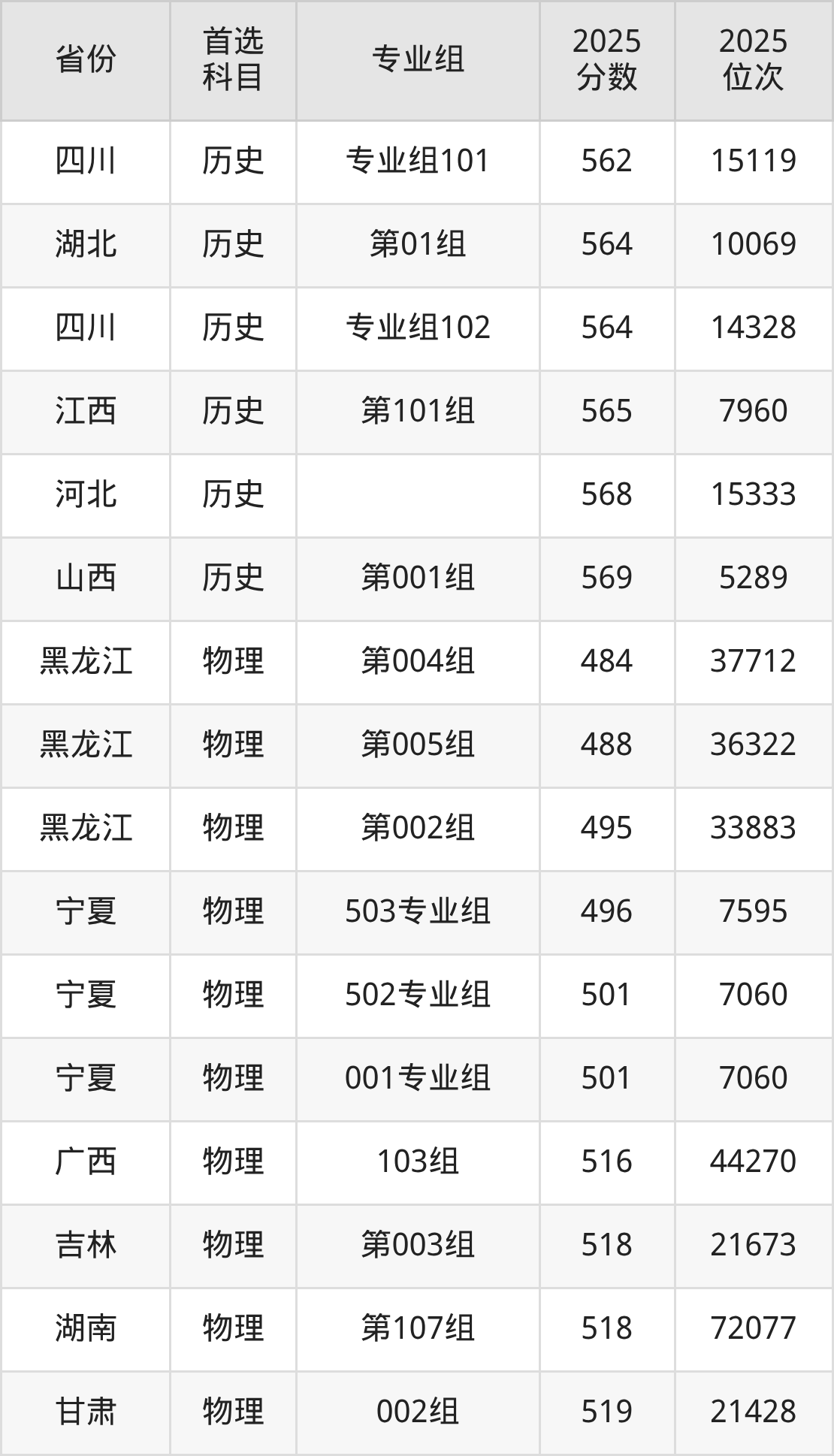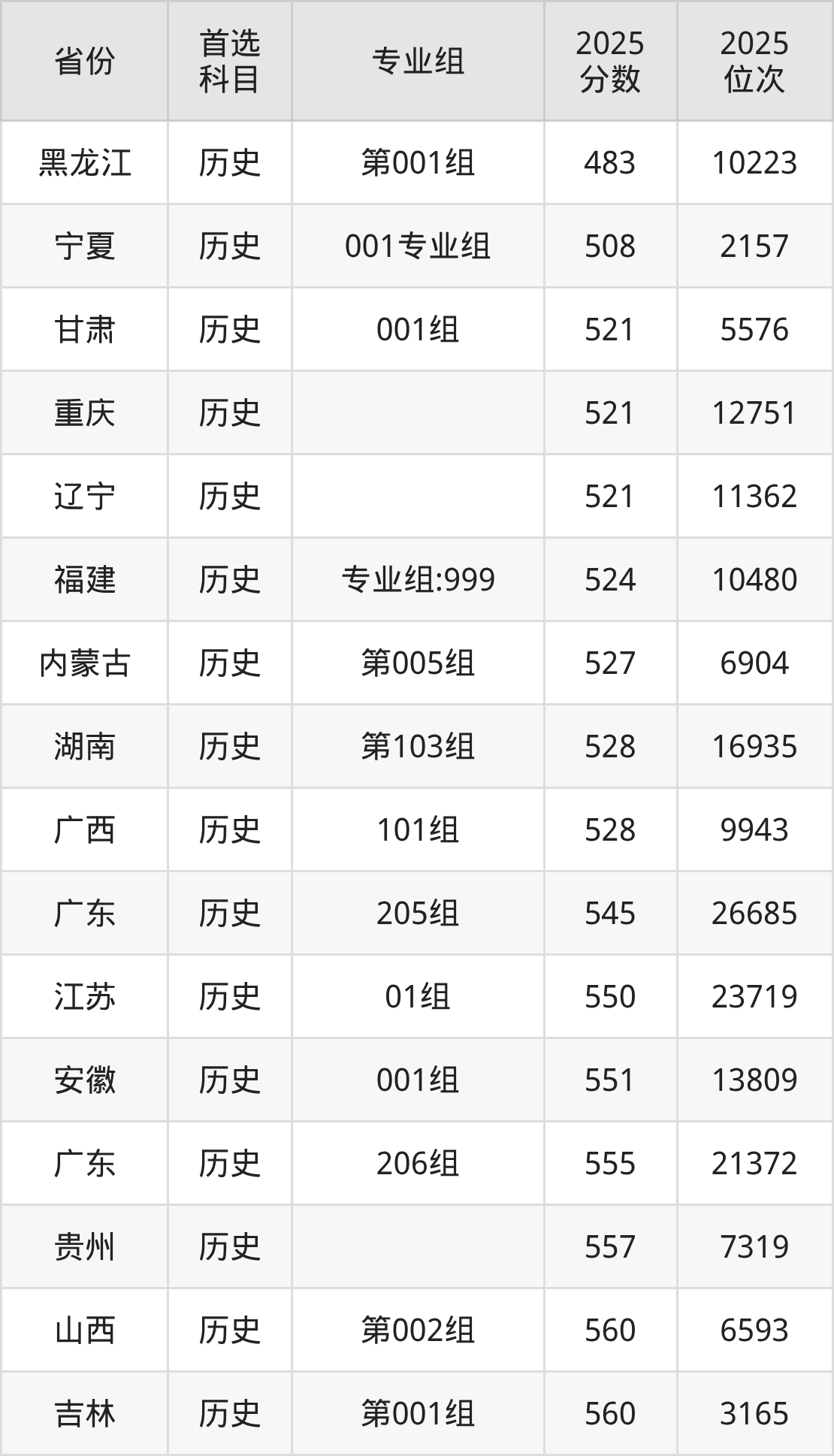 历史类最低分对应地区为黑龙江(第001组),录取位次为10223,超本科线78分;最高分对应地区为山西(第001组),录取位次为5289,超本科线126分。
