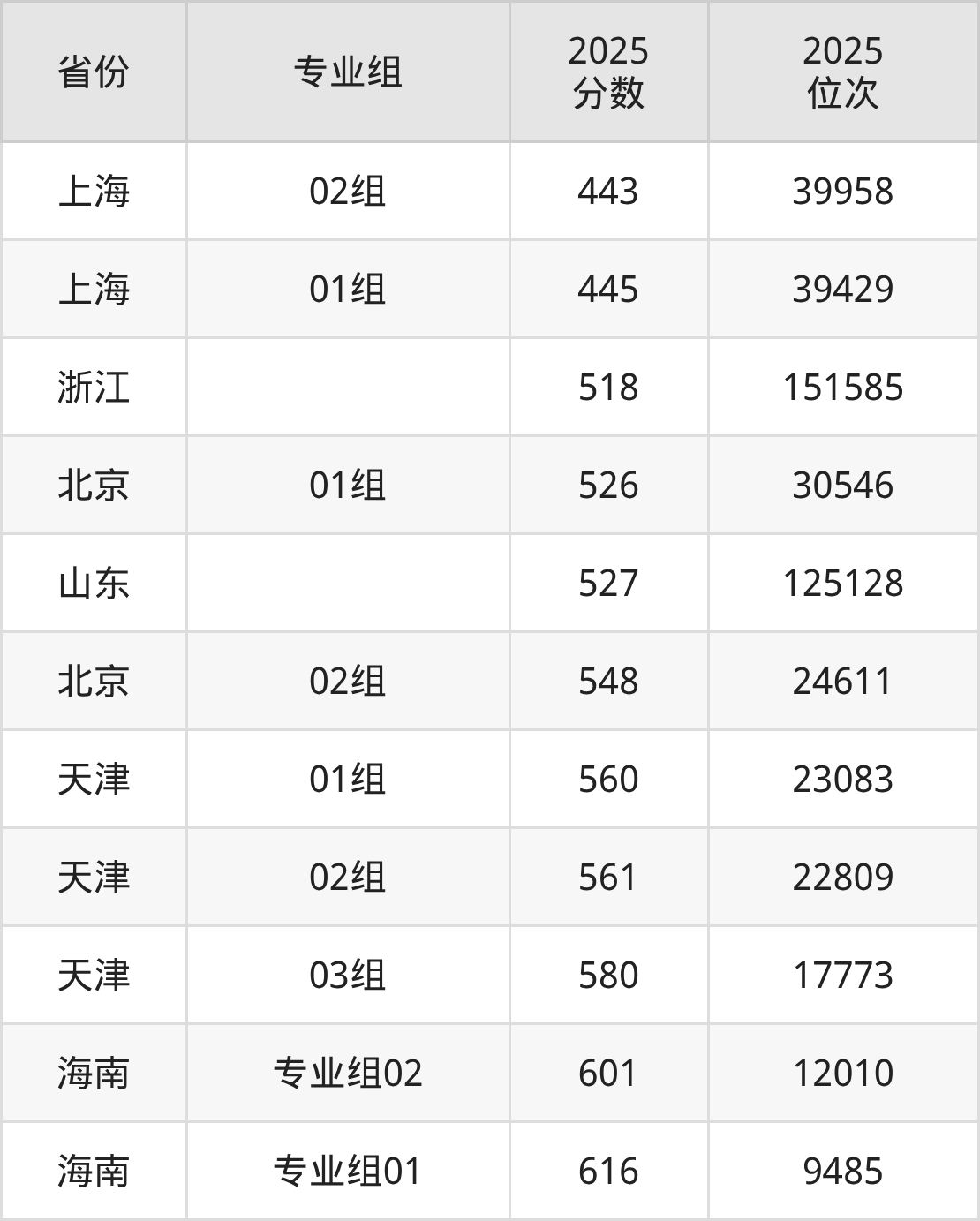 最低分对应地区为上海(02组),录取位次为39958,超本科线41分;最高分对应地区为海南(专业组01),录取位次为9485,超本科线136分。
