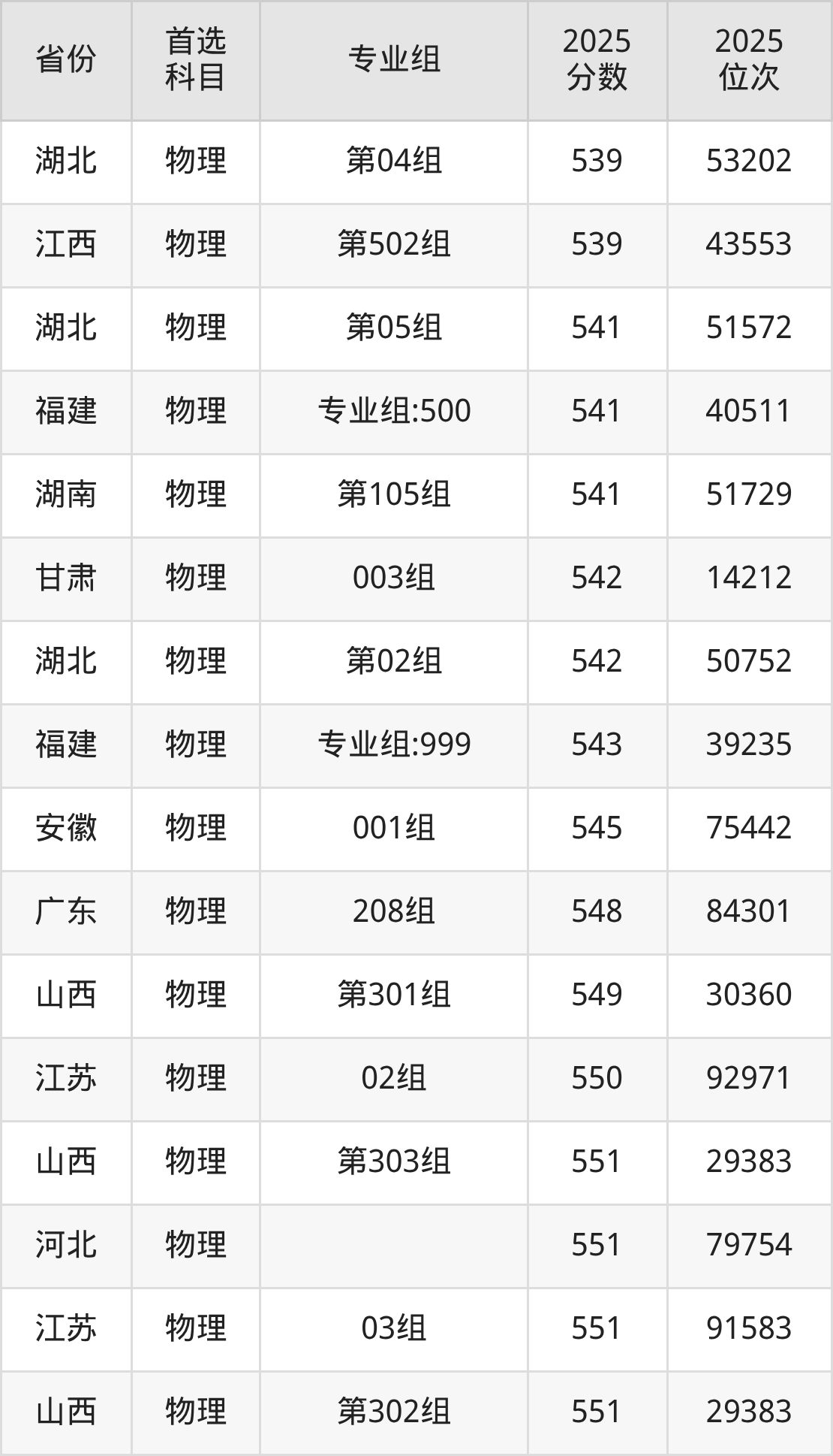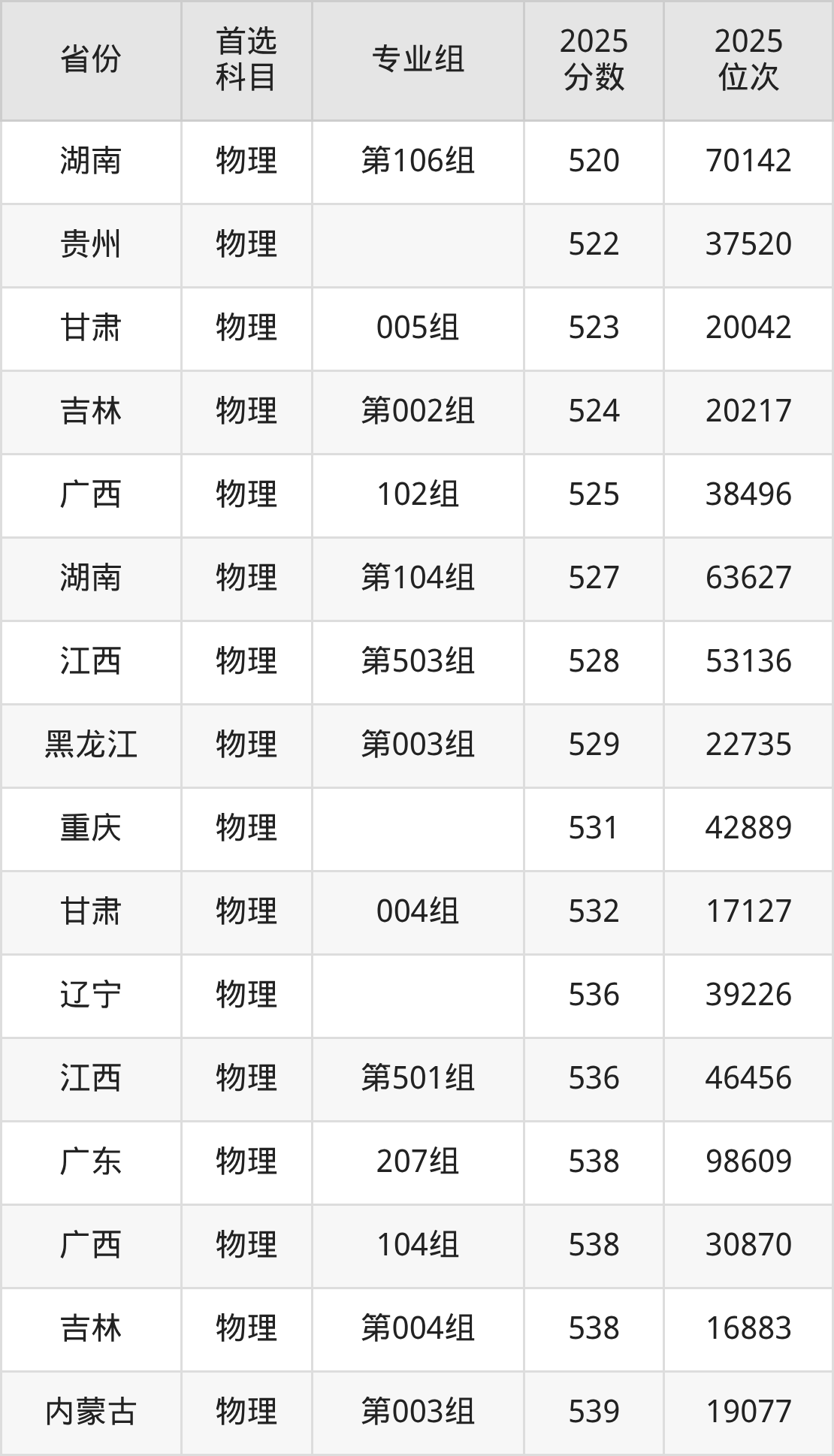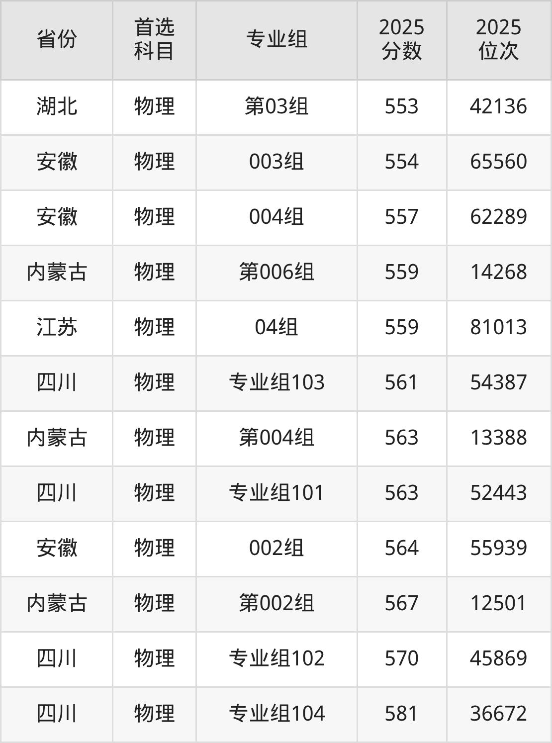 物理类最低分对应地区为黑龙江(第004组),录取位次为37712,超本科线124分;最高分对应地区为四川(专业组104),录取位次为36672,超本科B143分。