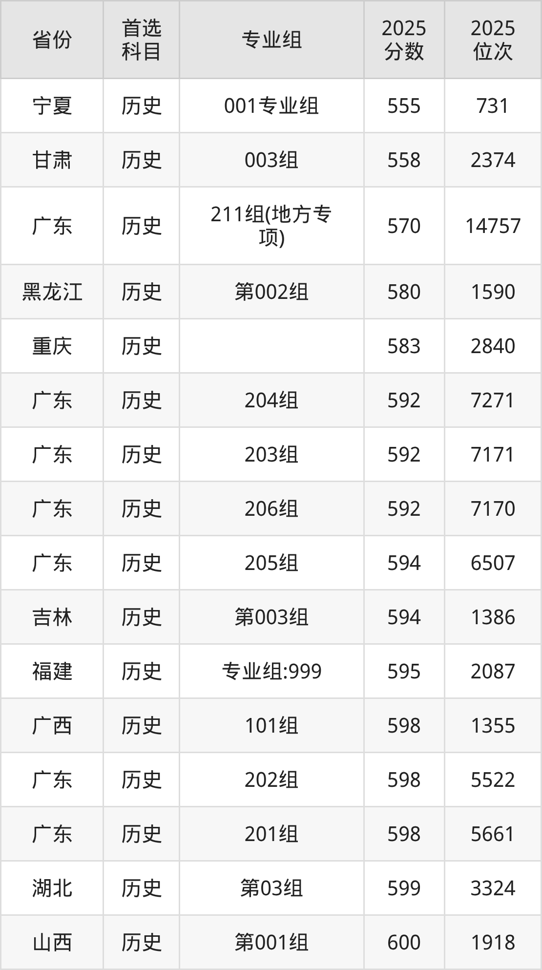 历史类:201组598分、5661名,202组598分、5522名,203组592分、7171名,204组592分、7271名,205组594分、6507名,206组592分、7170名,211组(地方专项)570分、14757名;