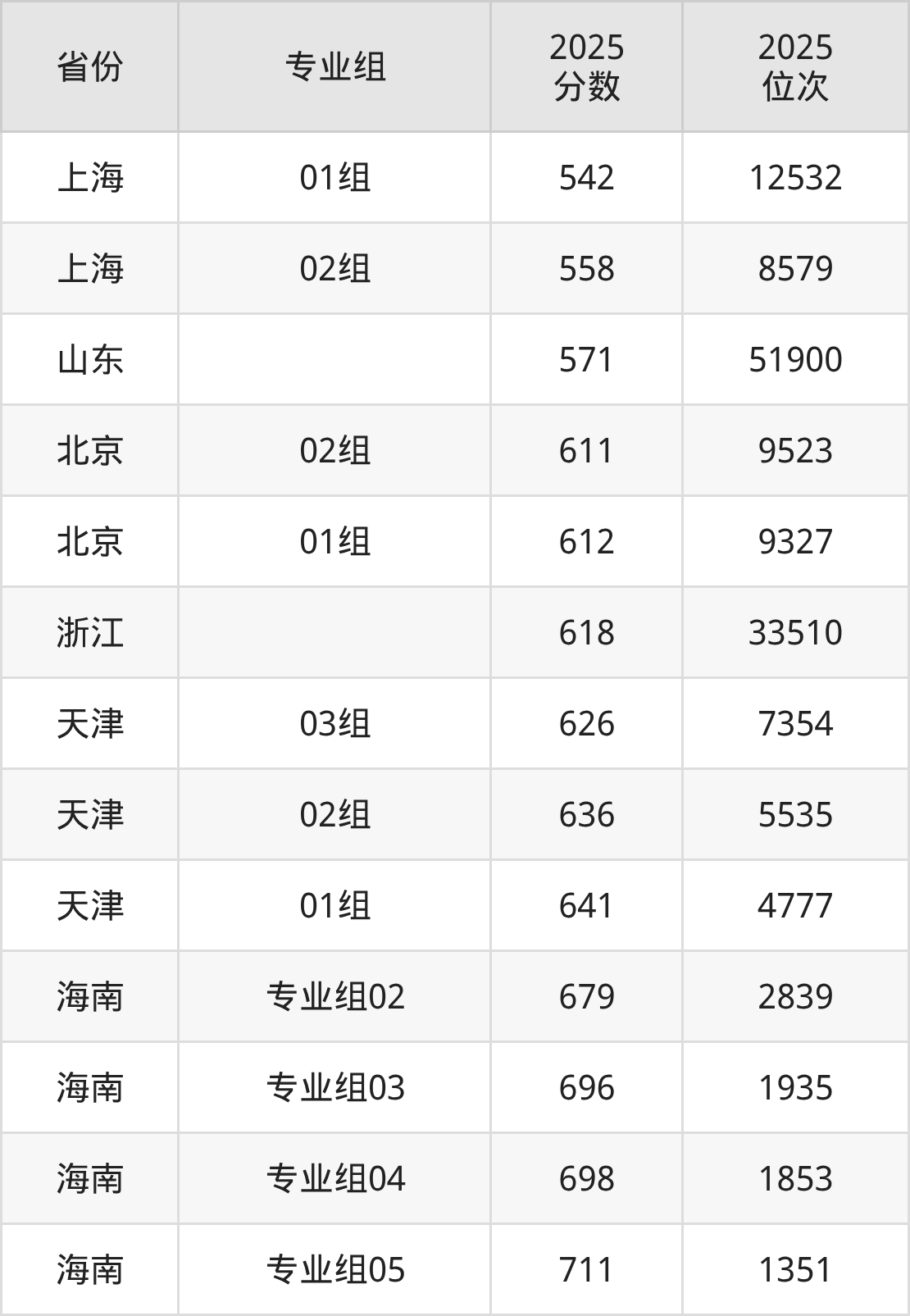 最低分对应地区为上海(01组),录取位次为12532;最高分对应地区为海南(专业组05),录取位次为1351,超本科线231分。