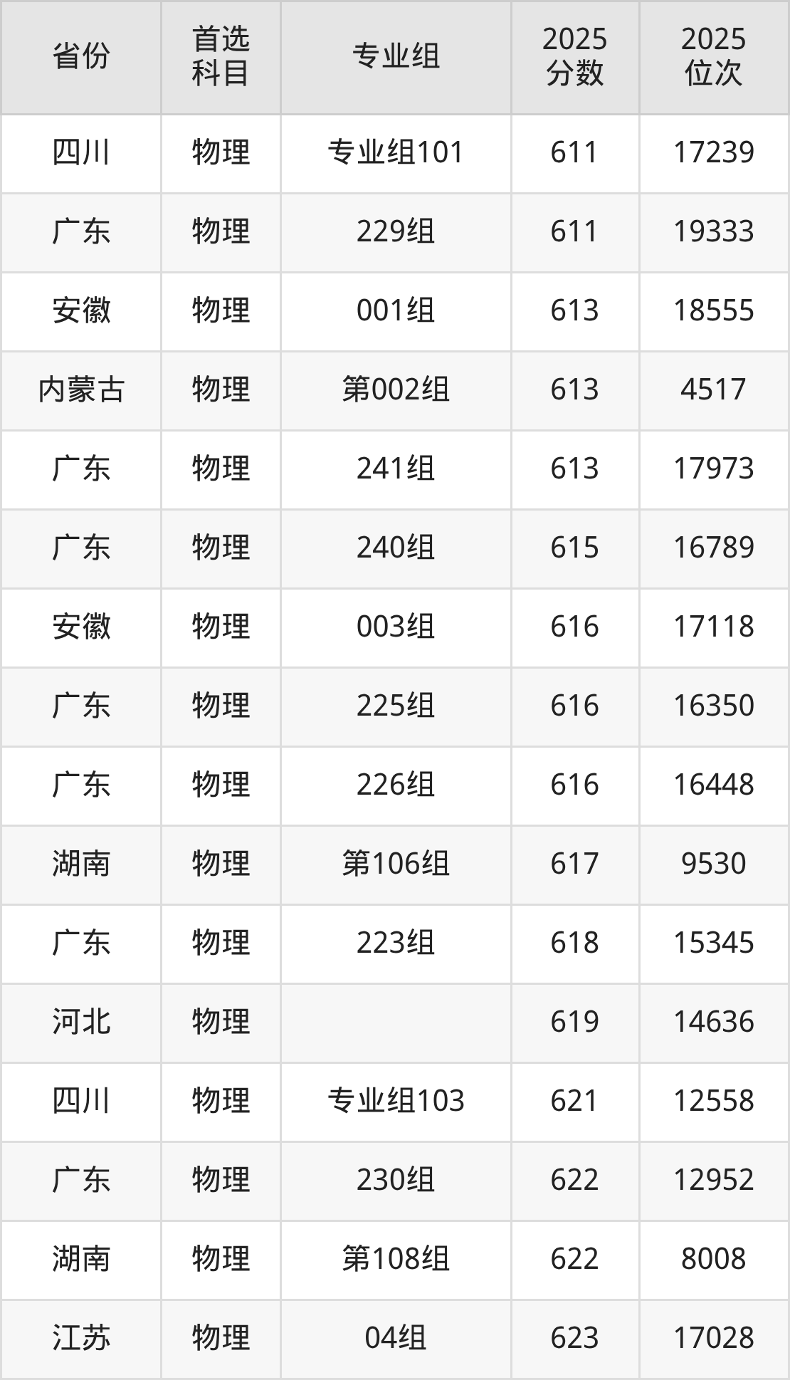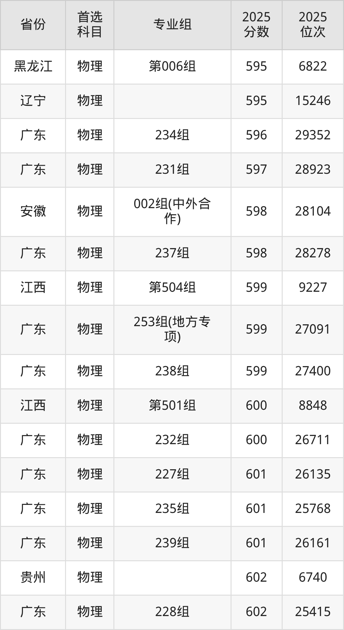 物理类:221组601分、26466名,222组606分、23073名,223组614分、18162名,224组608分、21725名,225组609分、21078名,226组616分、17054名,227组614分、18162名,228组615分、17632名,229组599分、27935名,230组597分、29390名,231组596分、30113名,232组623分、13601名,233组595分、30885名,234组599分、27935名,235组602分、25782名,236组595分、30885名,237组598分、28644名,238组592分、33228名,239组601分、26466名,240组605分、23747名,241组600分、27168名,242组602分、25782名,243组608分、21725名,244组597分、29390名,245组(中外合作)584分、40023名,251组(地方专项)602分、25782名,252组(地方专项)584分、40023名,253组(地方专项)574分、49255名,254组(地方专项)586分、38271名,255组(地方专项)580分、43608名。