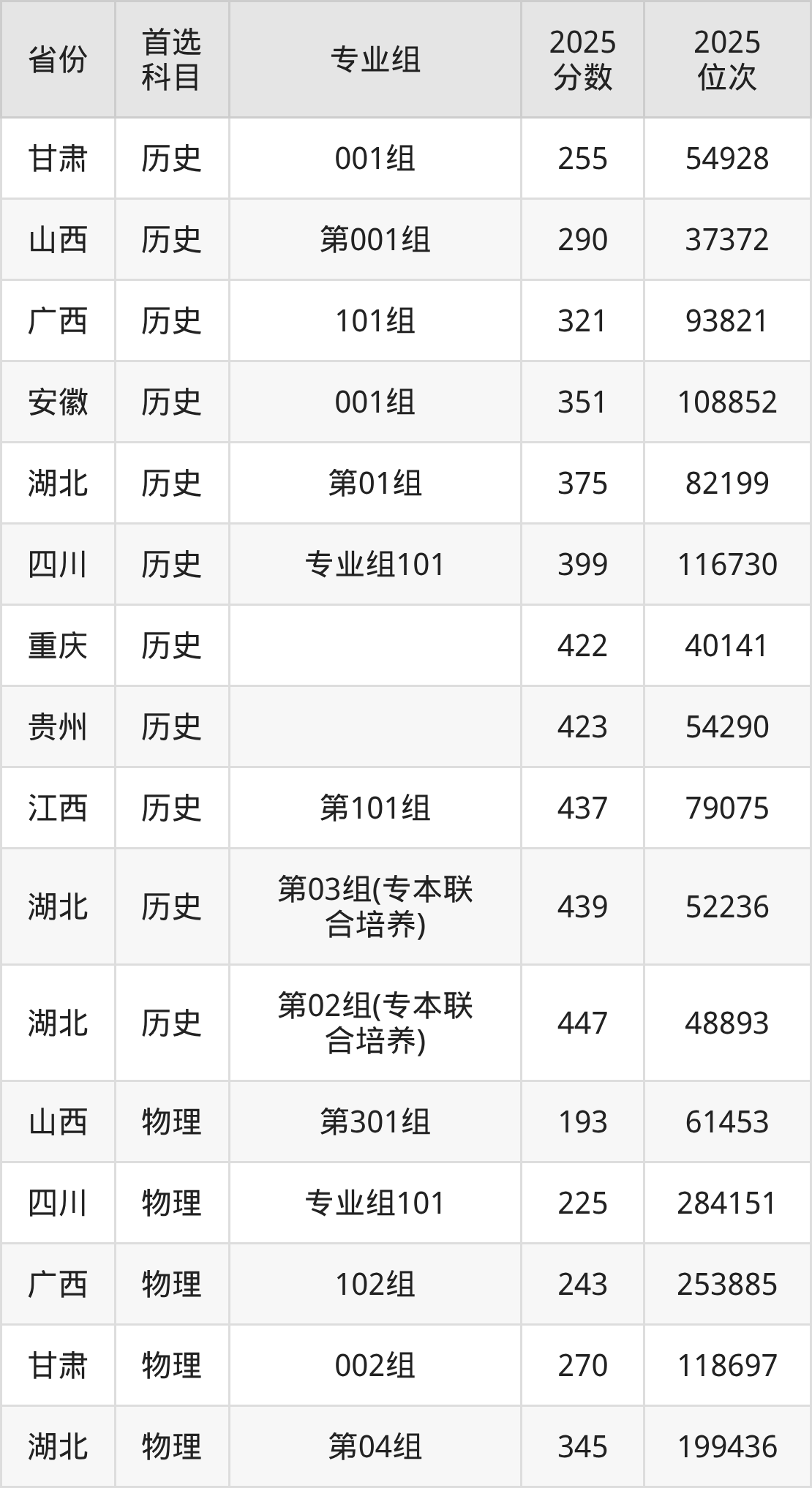 历史类最低分对应地区为甘肃(001组),录取位次为54928,超专科线95分;最高分对应地区为湖北(第02组(专本联合培养)),录取位次为48893,超专科线247分。