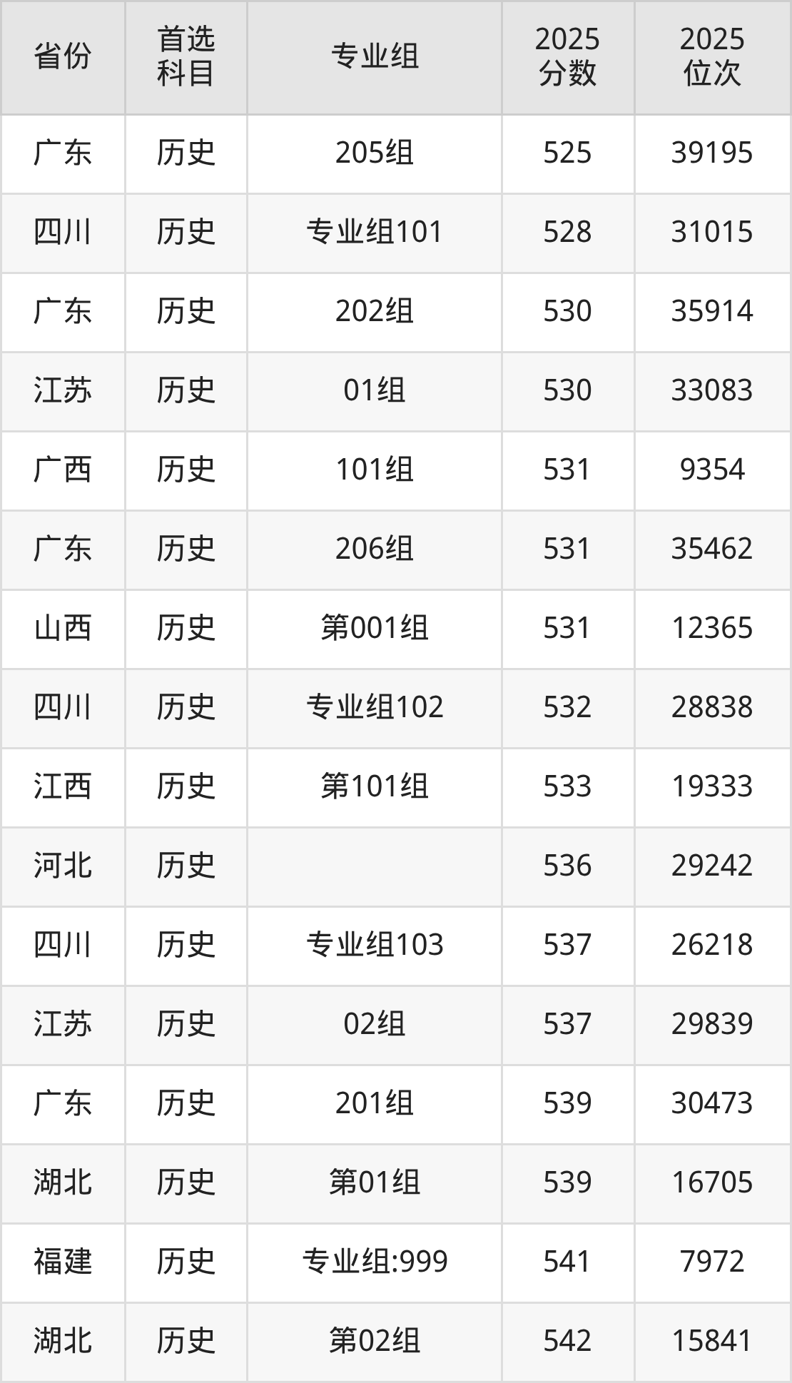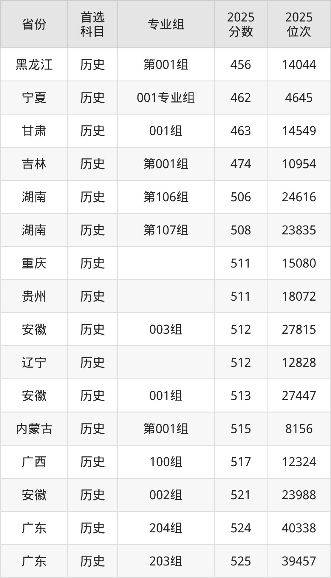 历史类最低分对应地区为黑龙江(第001组),录取位次为14044,超本科线51分;最高分对应地区为湖北(第02组),录取位次为15841。