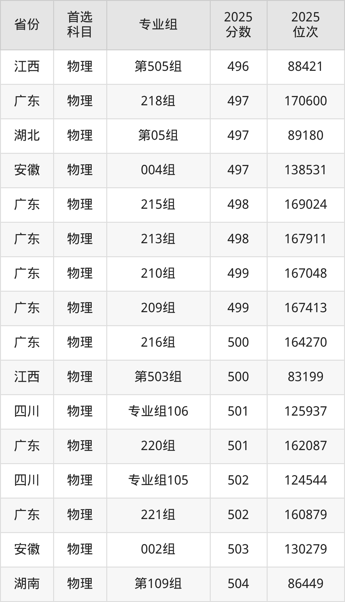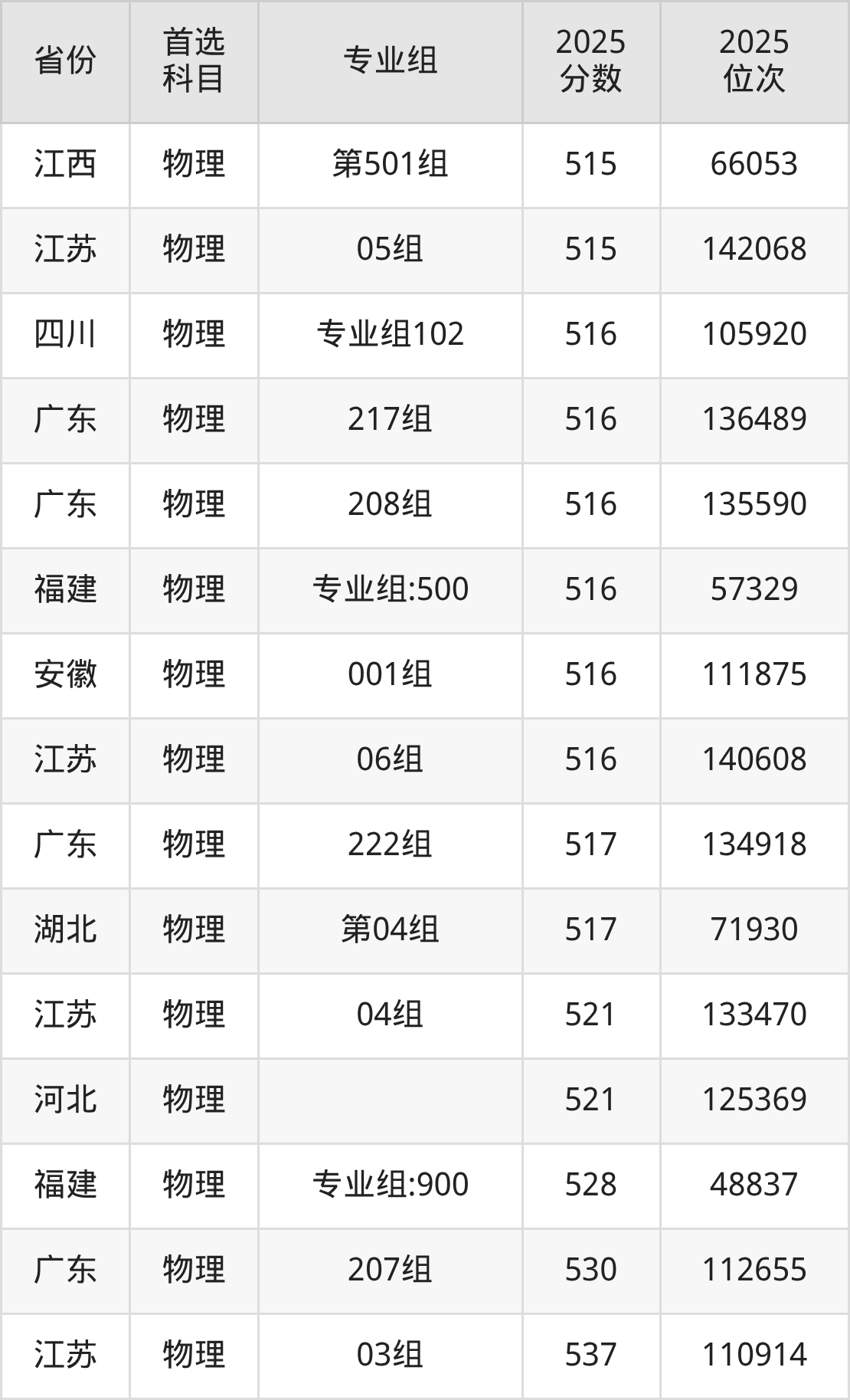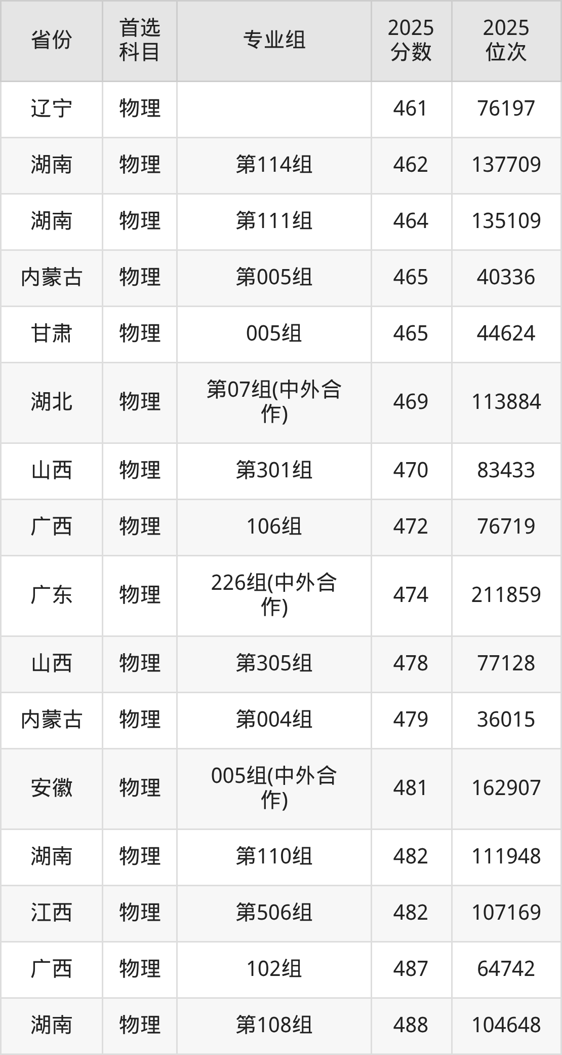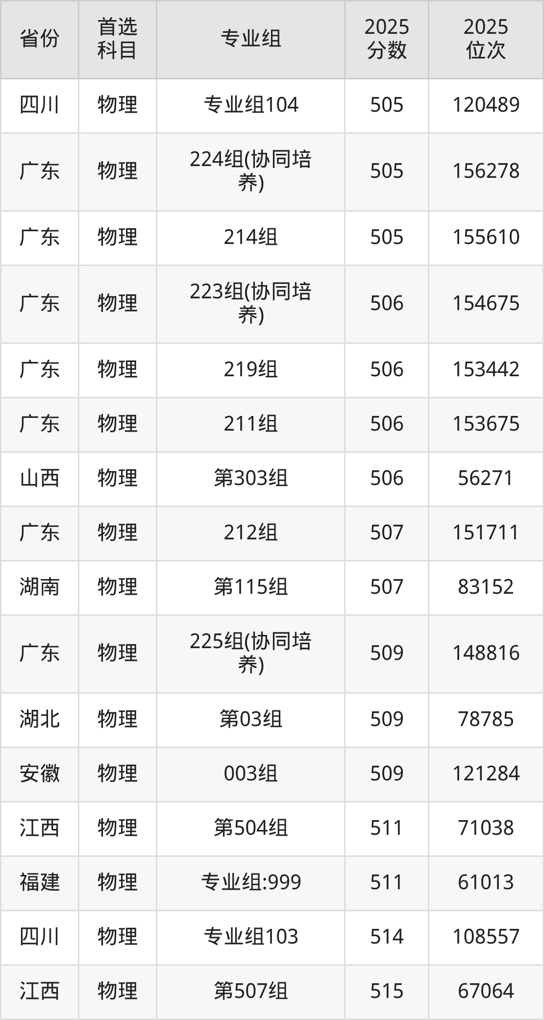 物理类:207组530分、112655名,208组516分、135590名,209组499分、167413名,210组499分、167048名,211组506分、153675名,212组507分、151711名,213组498分、167911名,214组505分、155610名,215组498分、169024名,216组500分、164270名,217组516分、136489名,218组497分、170600名,219组506分、153442名,220组501分、162087名,221组502分、160879名,222组517分、134918名,223组(协同培养)506分、154675名,224组(协同培养)505分、156278名,225组(协同培养)509分、148816名,226组(中外合作)474分、211859名;