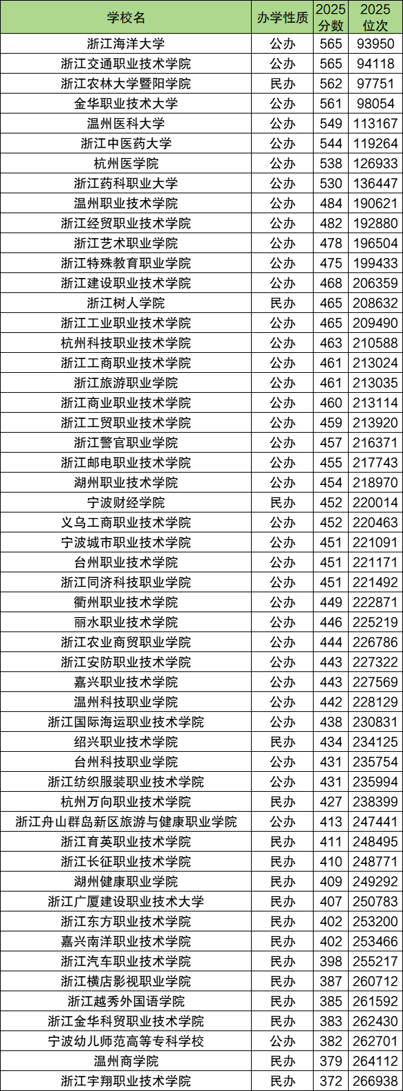 2025年浙江二段各大学中,分数线最高、最难考的院校是浙江海洋大学,最低录取分数565分,录取位次93950位;