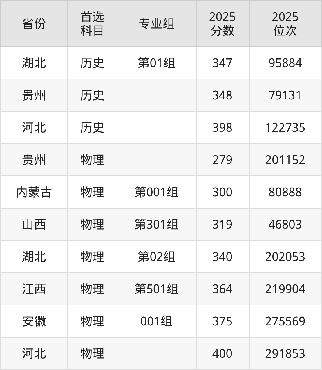 历史类最低分对应地区为湖北(第01组),录取位次为95884,超专科线147分;最高分对应地区为河北,录取位次为122735,超专科线198分。