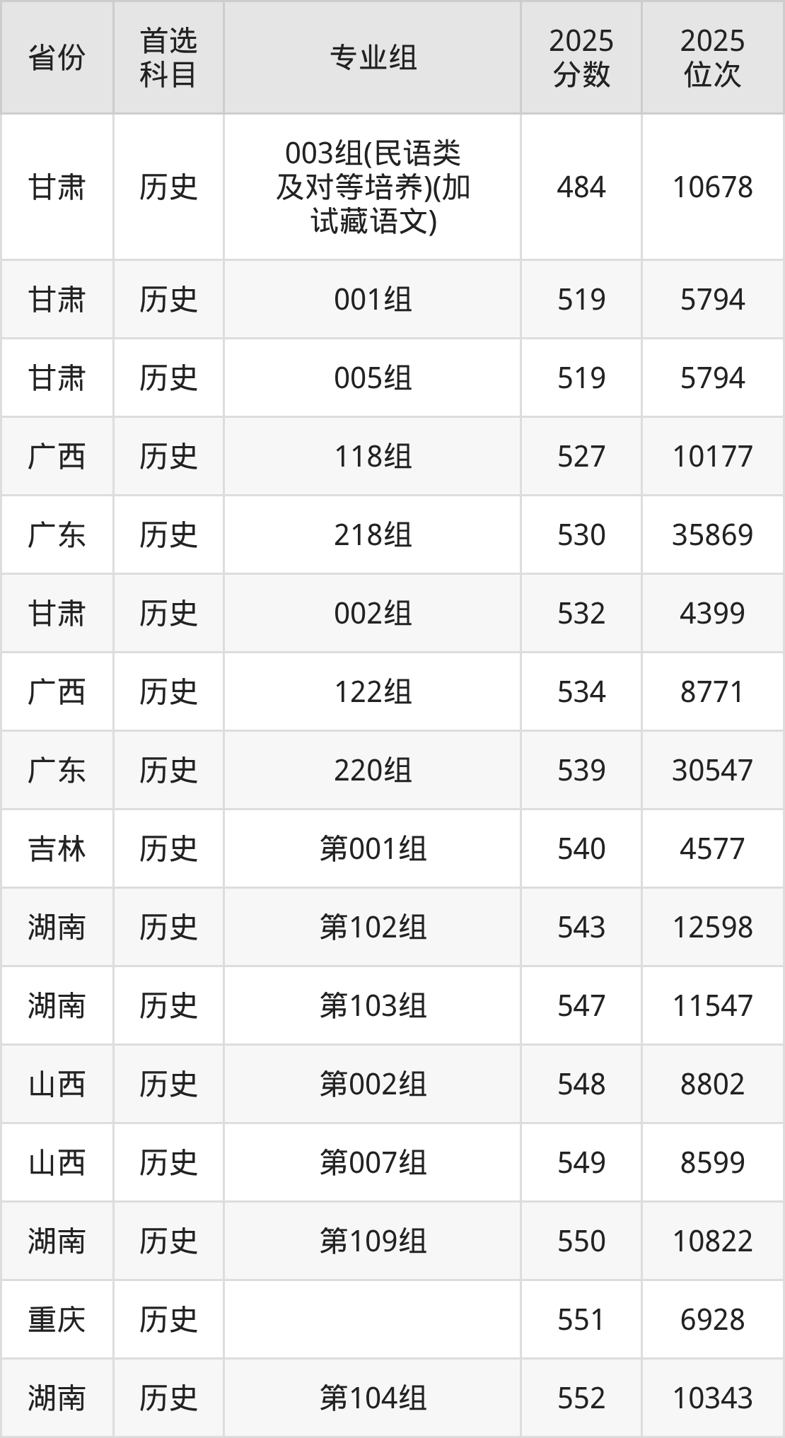 历史类最低分对应地区为甘肃(003组(民语类及对等培养)(加试藏语文)),录取位次为10678,超本科线72分;最高分对应地区为四川(专业组102),录取位次为10008。
