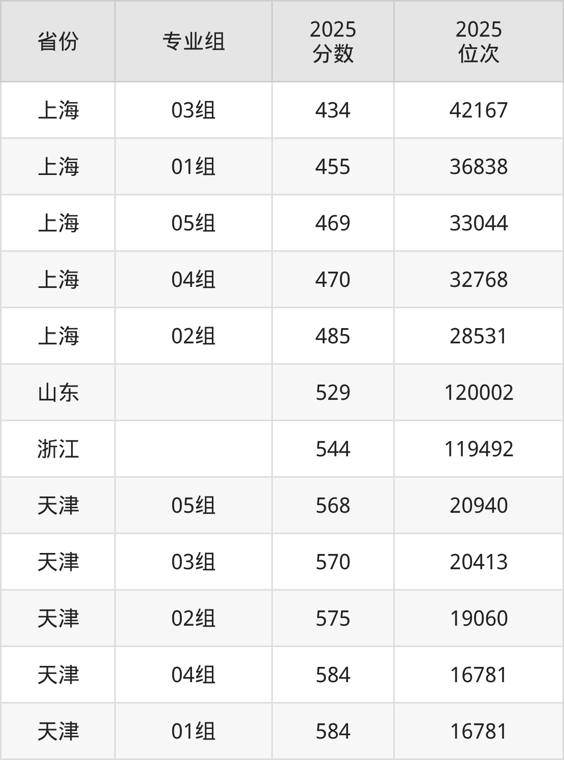 最低分对应地区为上海(03组),录取位次为42167,超本科线32分;最高分对应地区为天津(01组),录取位次为16781,超本科线108分。