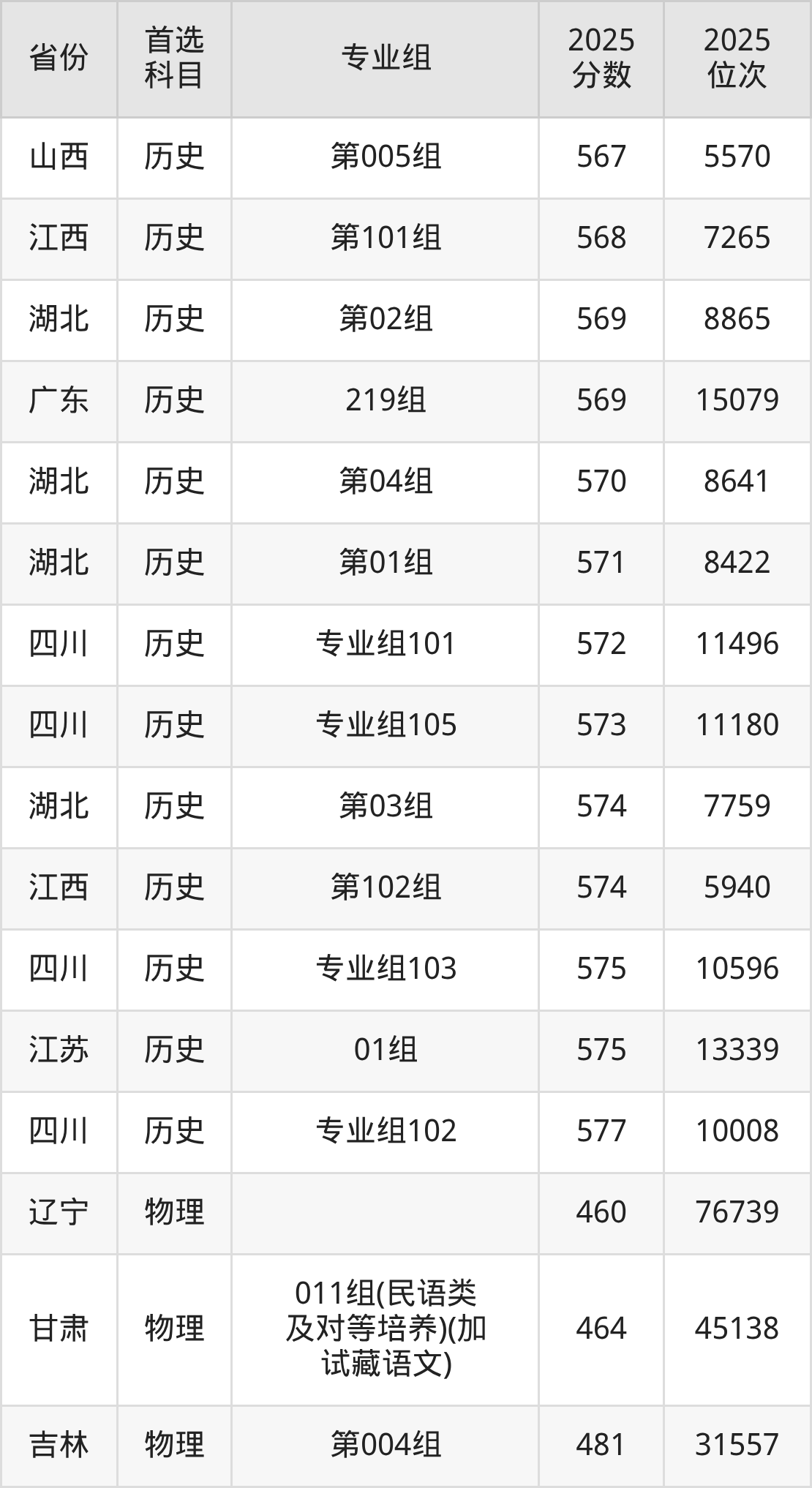 2025年西藏大学在新高考3+1+2地区的录取分数线为:历史类484分-577分、物理类460分-583分。