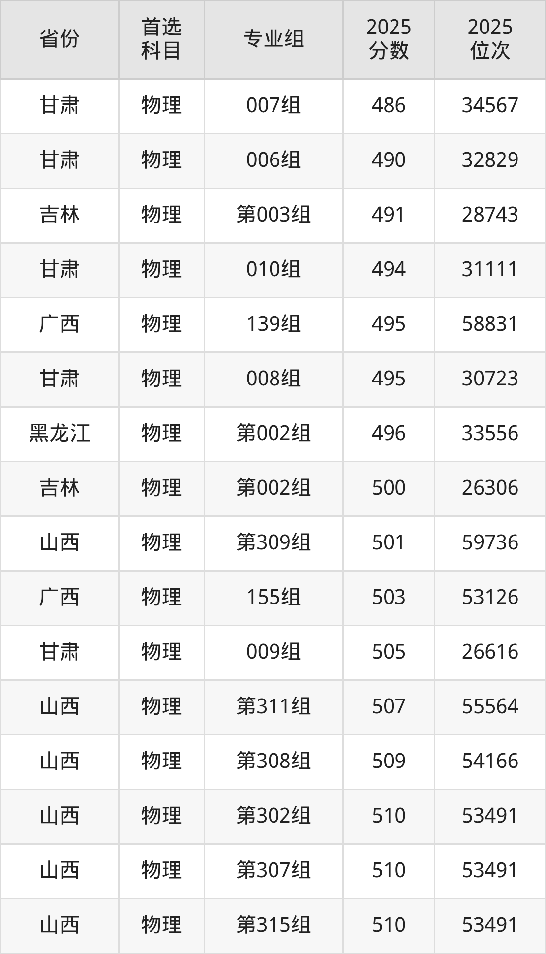 物理类最低分对应地区为辽宁,录取位次为76739,超本科线127分;最高分对应地区为江苏(04组),录取位次为51945。