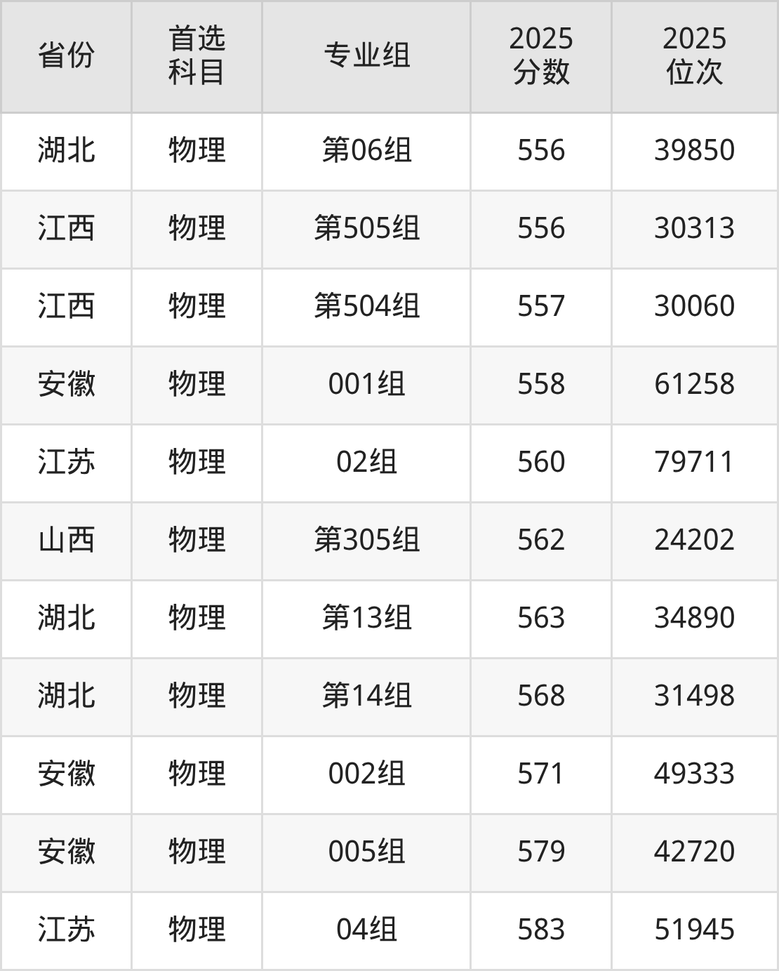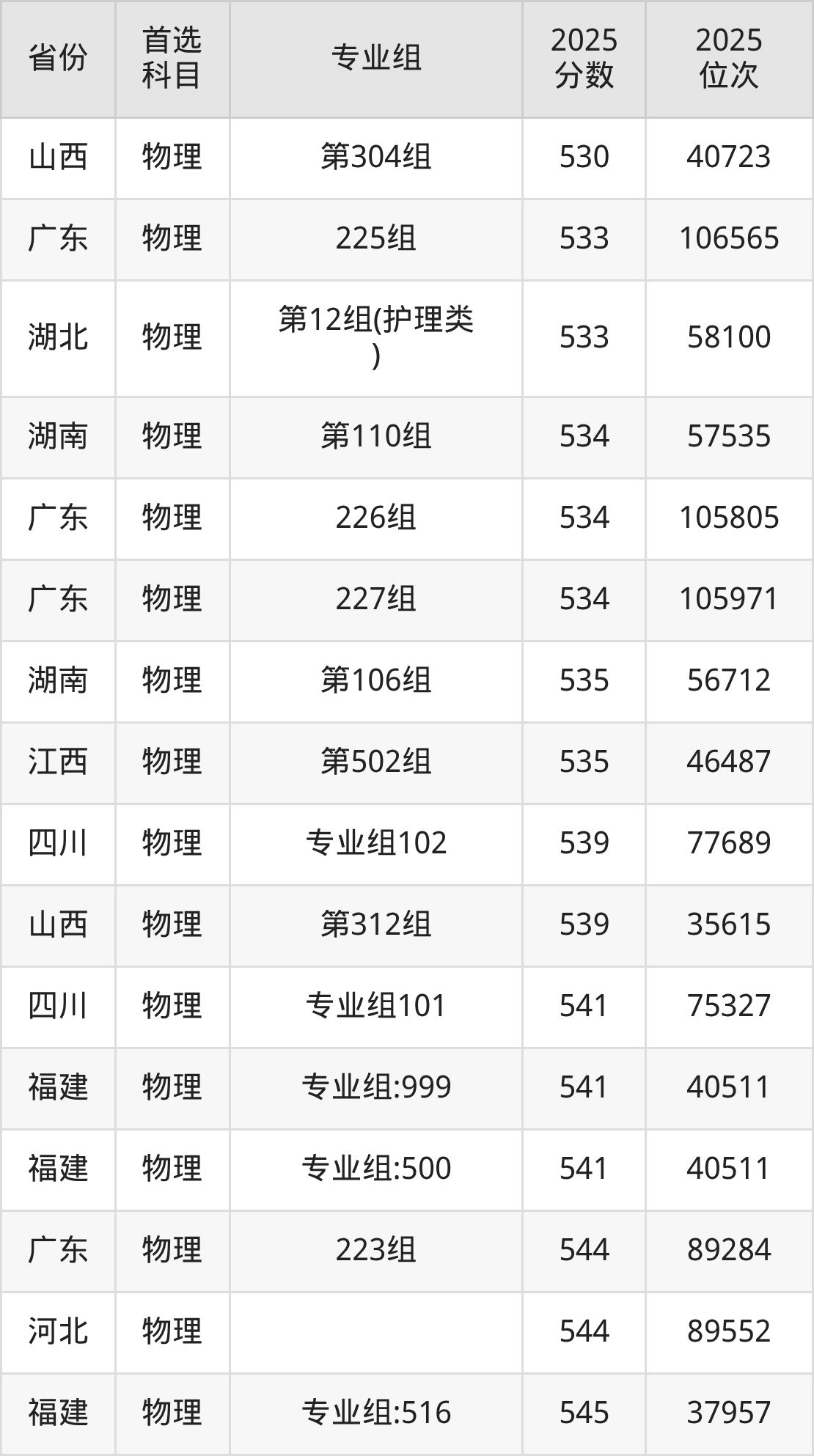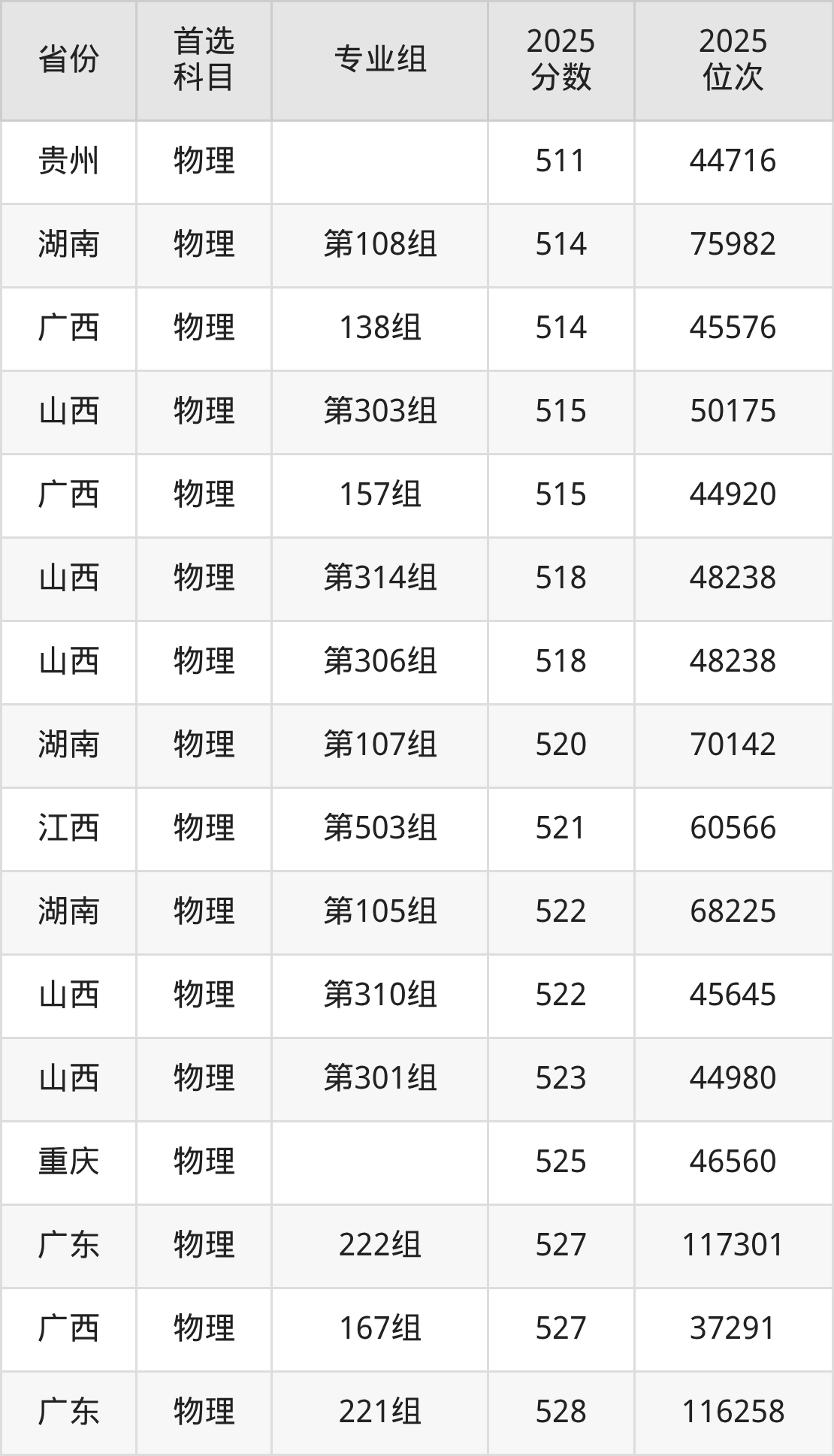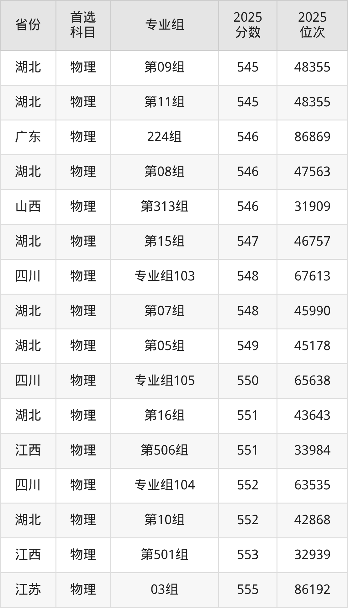 物理类:第109组548分、42749名,第110组526分、61097名,第111组526分、61097名,第114组530分、57491名,第116组523分、63989名,第118组529分、58417名,第119组525分、62058名,第120组546分、44249名,第122组544分、45813名,第123组540分、48925名,第124组546分、44249名;