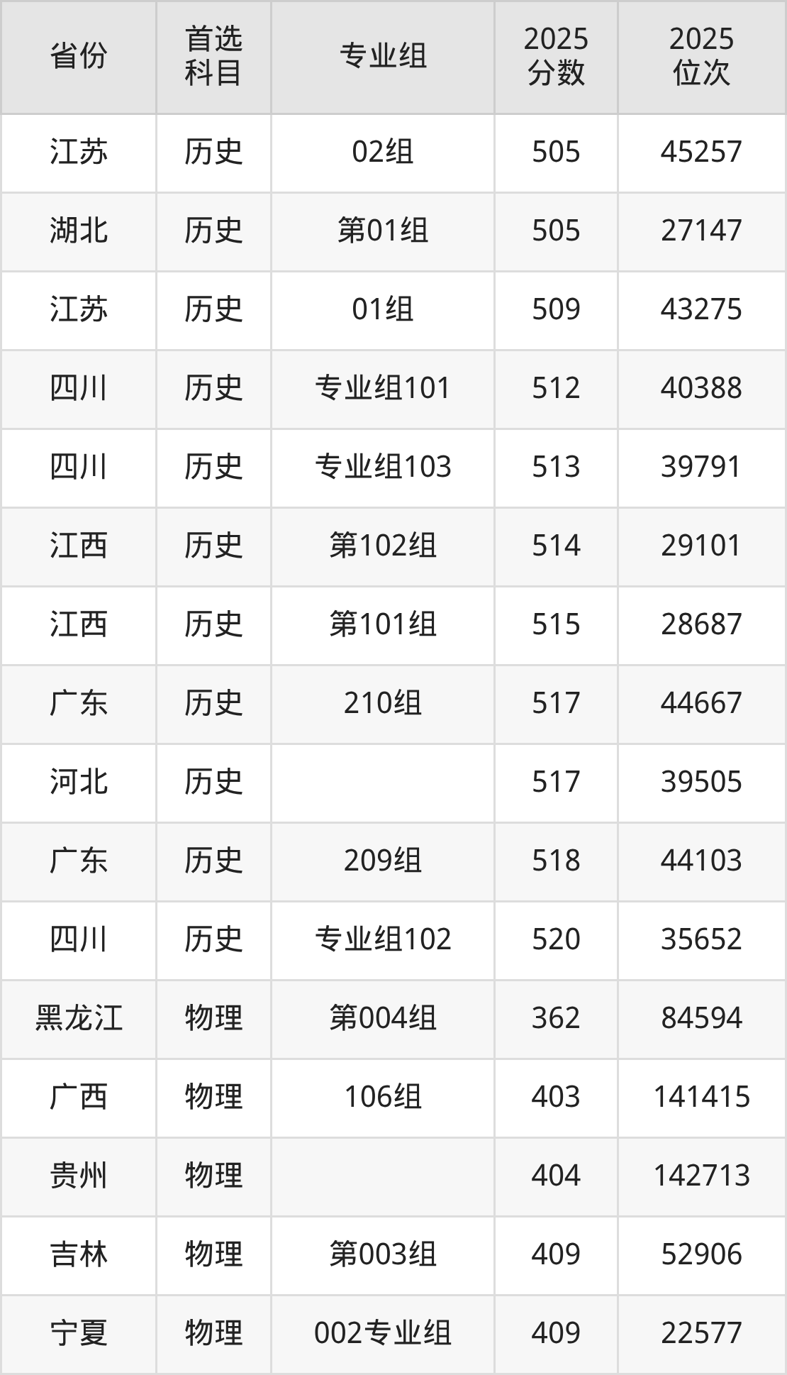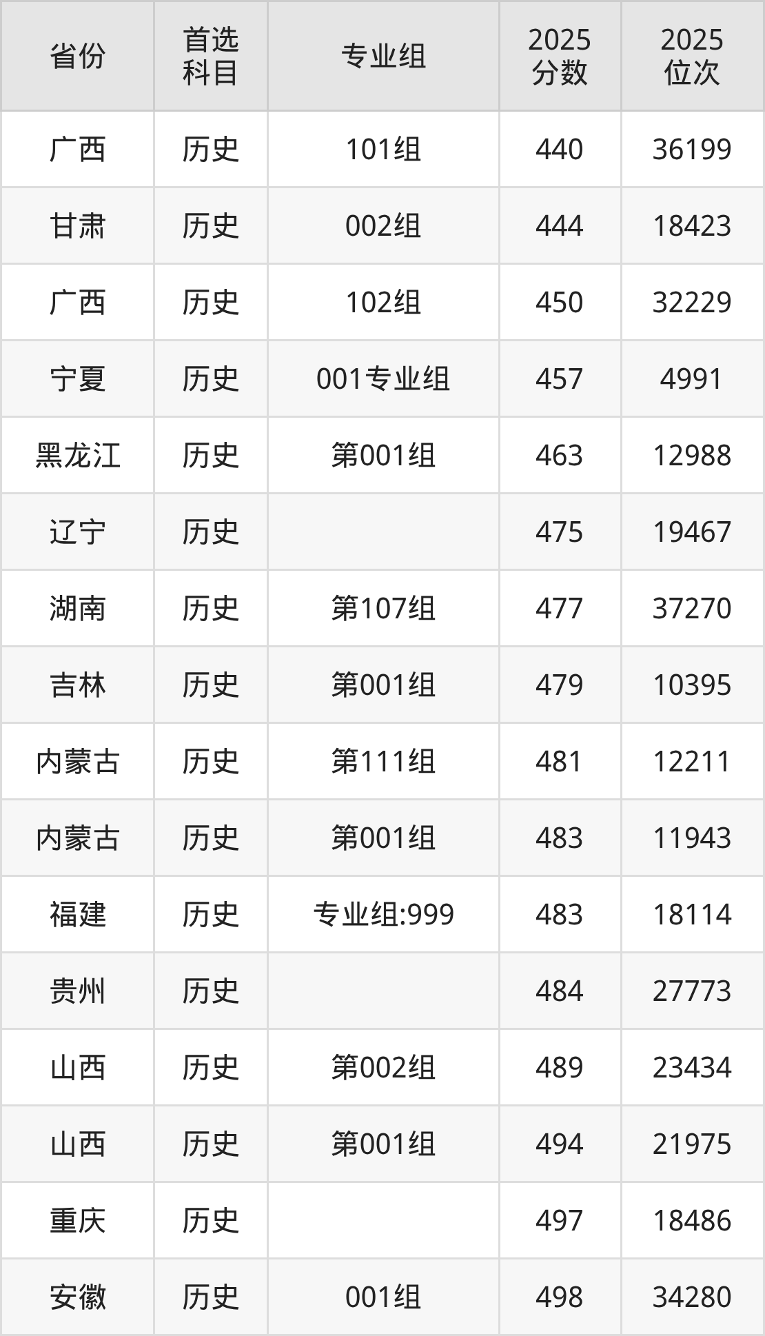 历史类最低分对应地区为广西(101组),录取位次为36199,超本科线38分;最高分对应地区为四川(专业组102),录取位次为35652,超本科B53分。