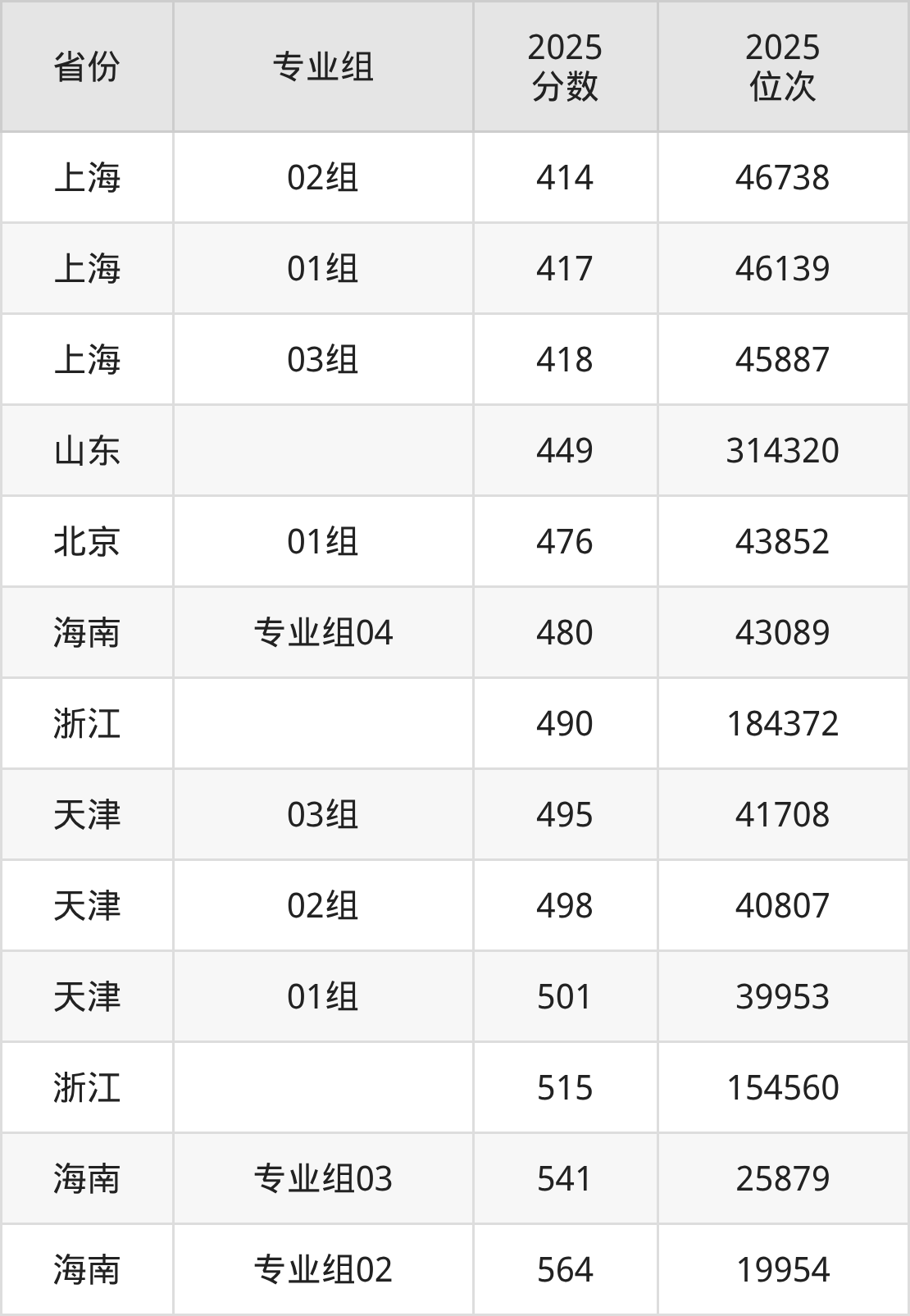 最低分对应地区为上海(02组),录取位次为46738,超本科线12分;最高分对应地区为海南(专业组02),录取位次为19954,超本科线84分。