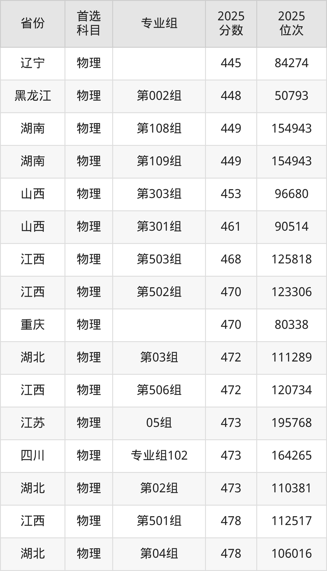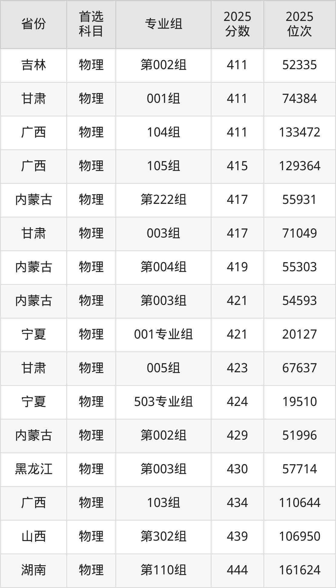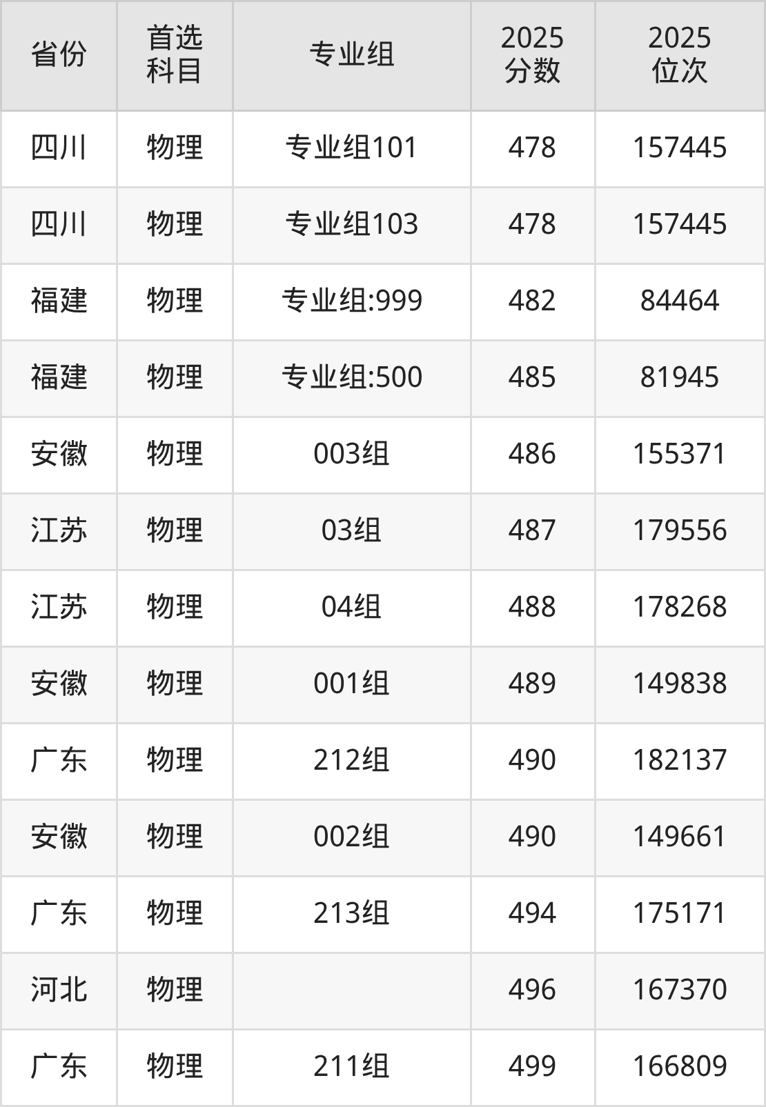 物理类最低分对应地区为黑龙江(第004组),录取位次为84594,超本科线2分;最高分对应地区为广东(211组),录取位次为166809,超本科线63分。