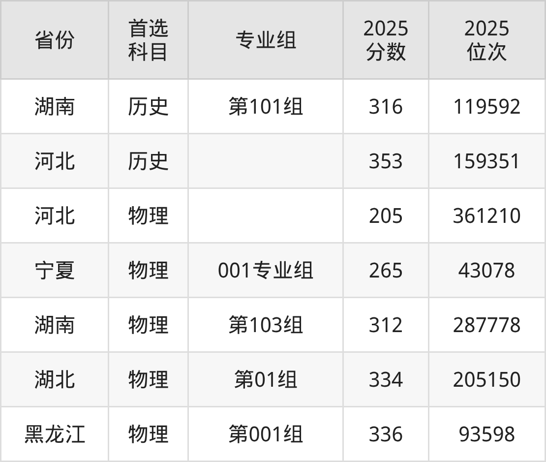 历史类最低分对应地区为湖南(第101组),录取位次为119592,超专科线116分;最高分对应地区为河北,录取位次为159351,超专科线153分。