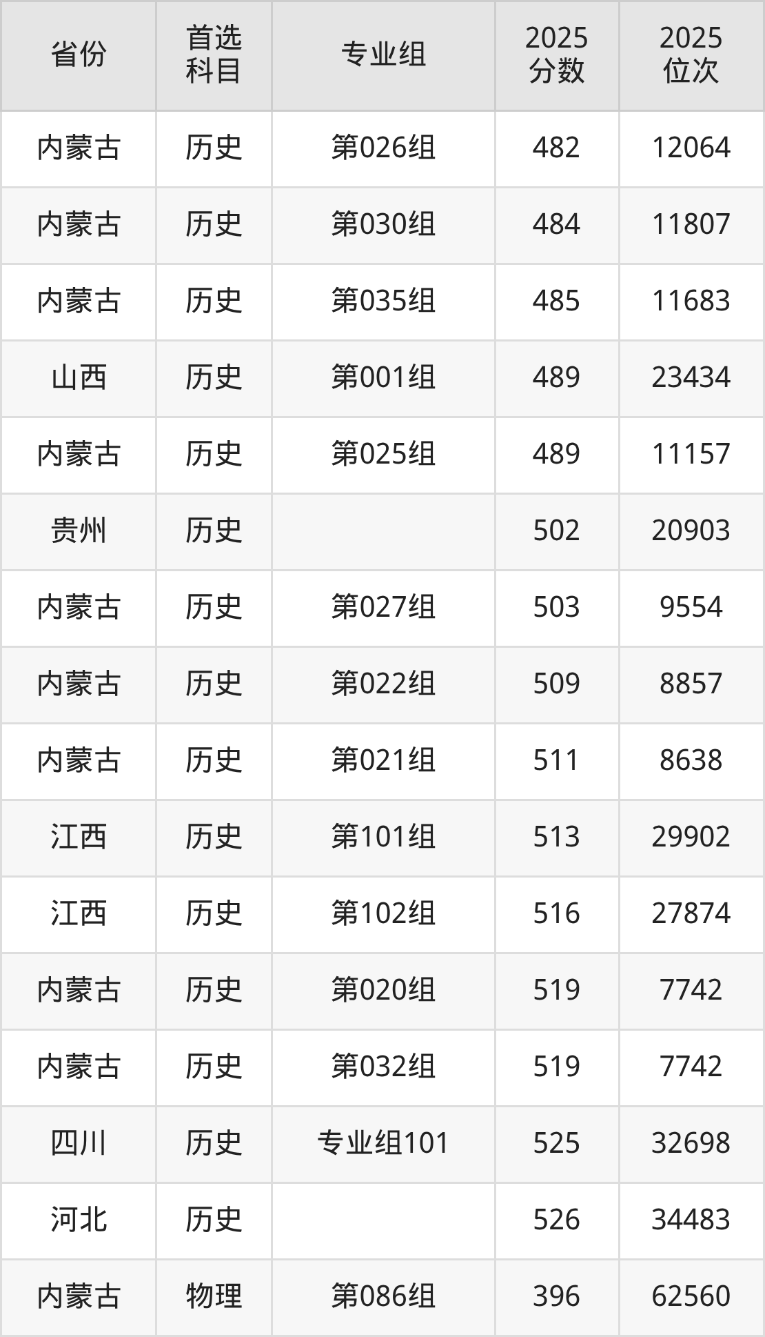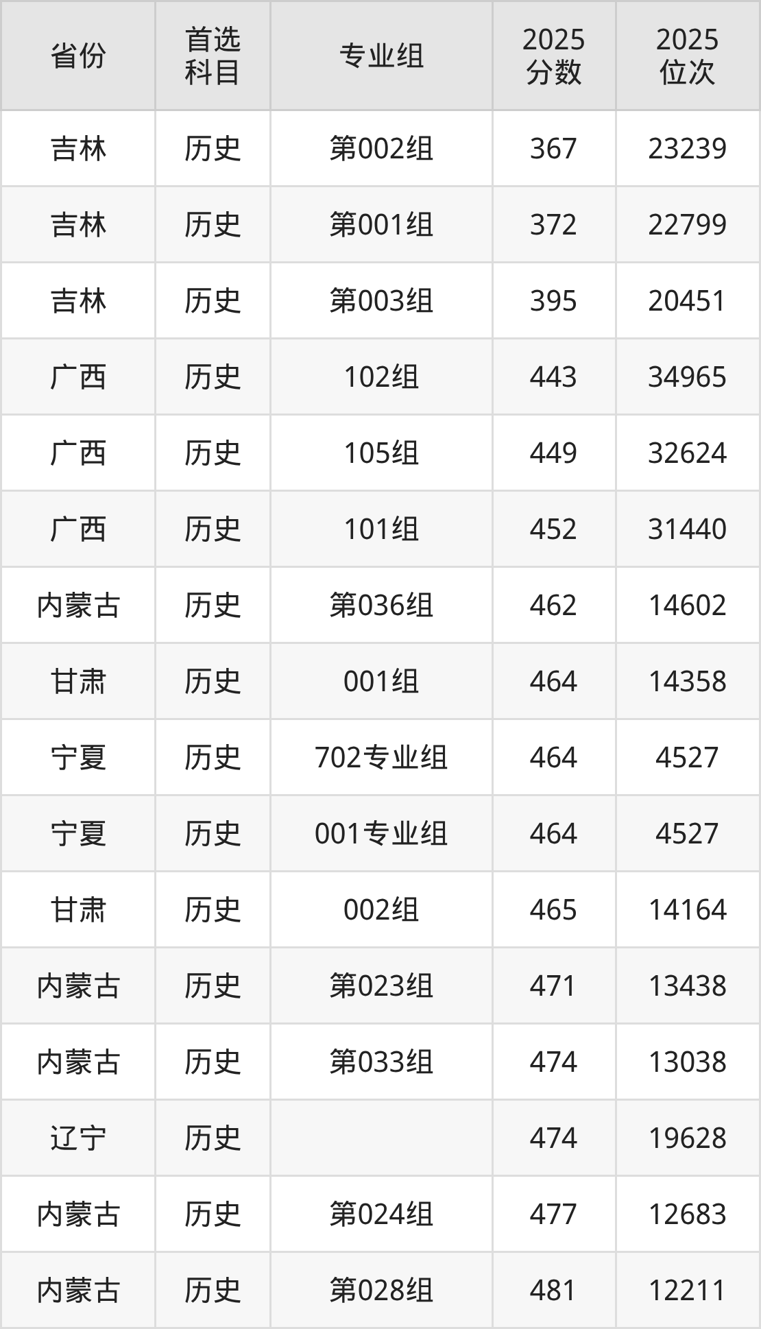 历史类最低分对应地区为吉林(第002组),录取位次为23239,低本科线17分;最高分对应地区为河北,录取位次为34483,超本科线49分。