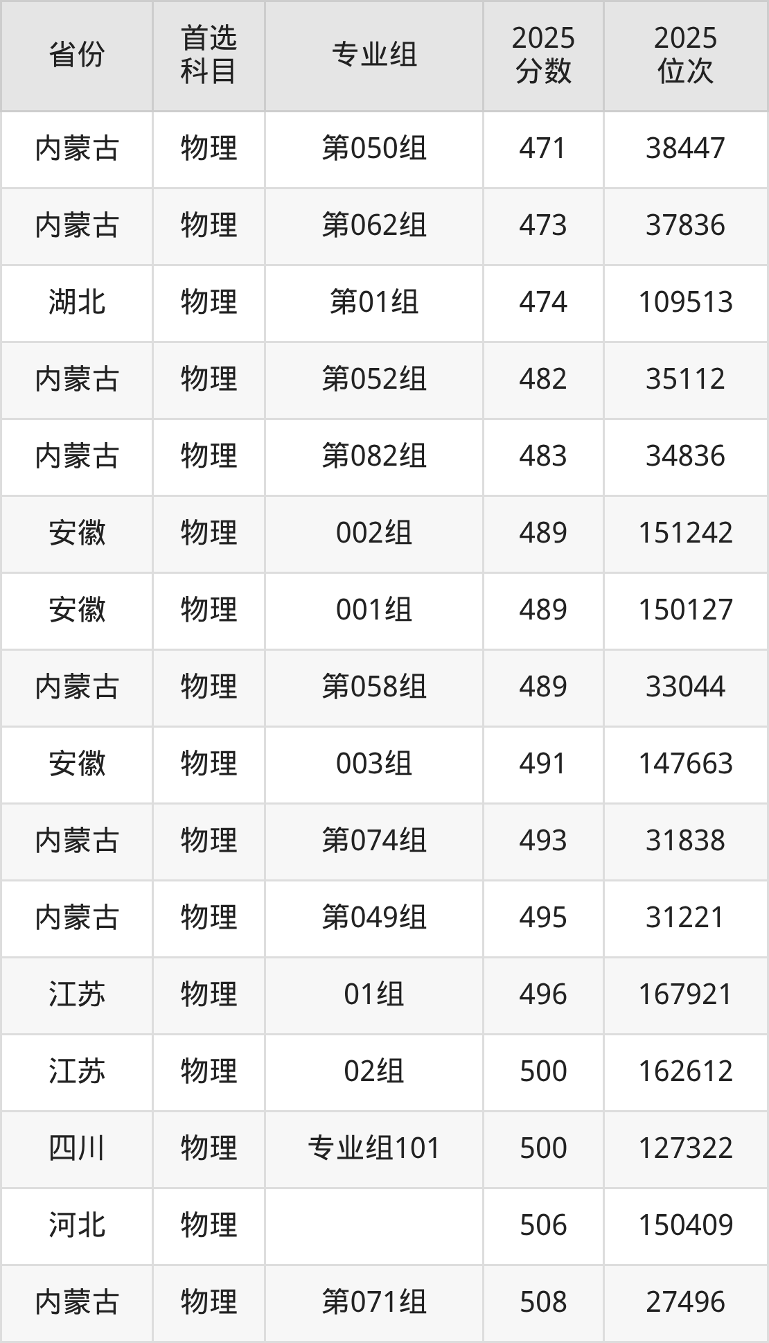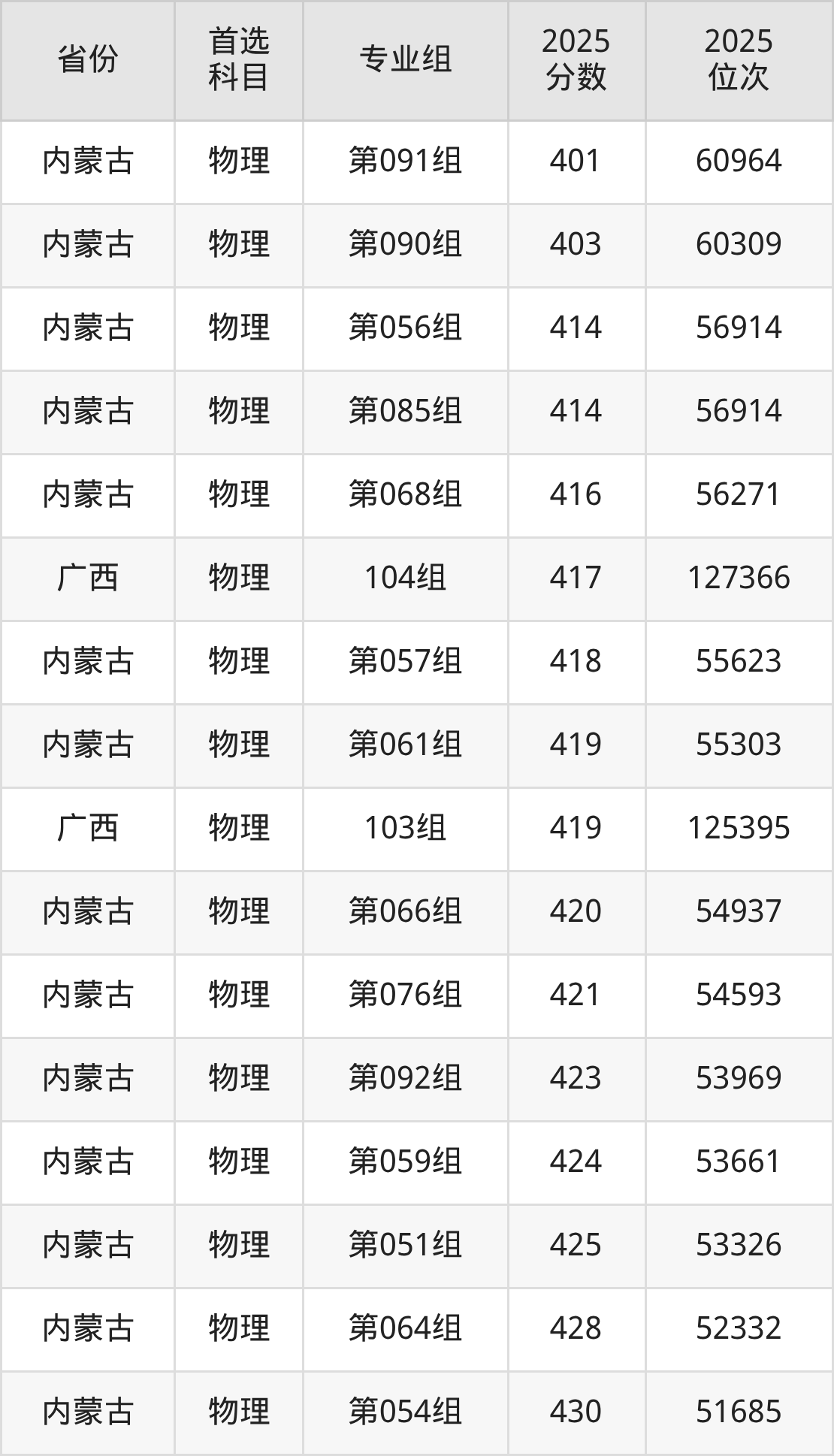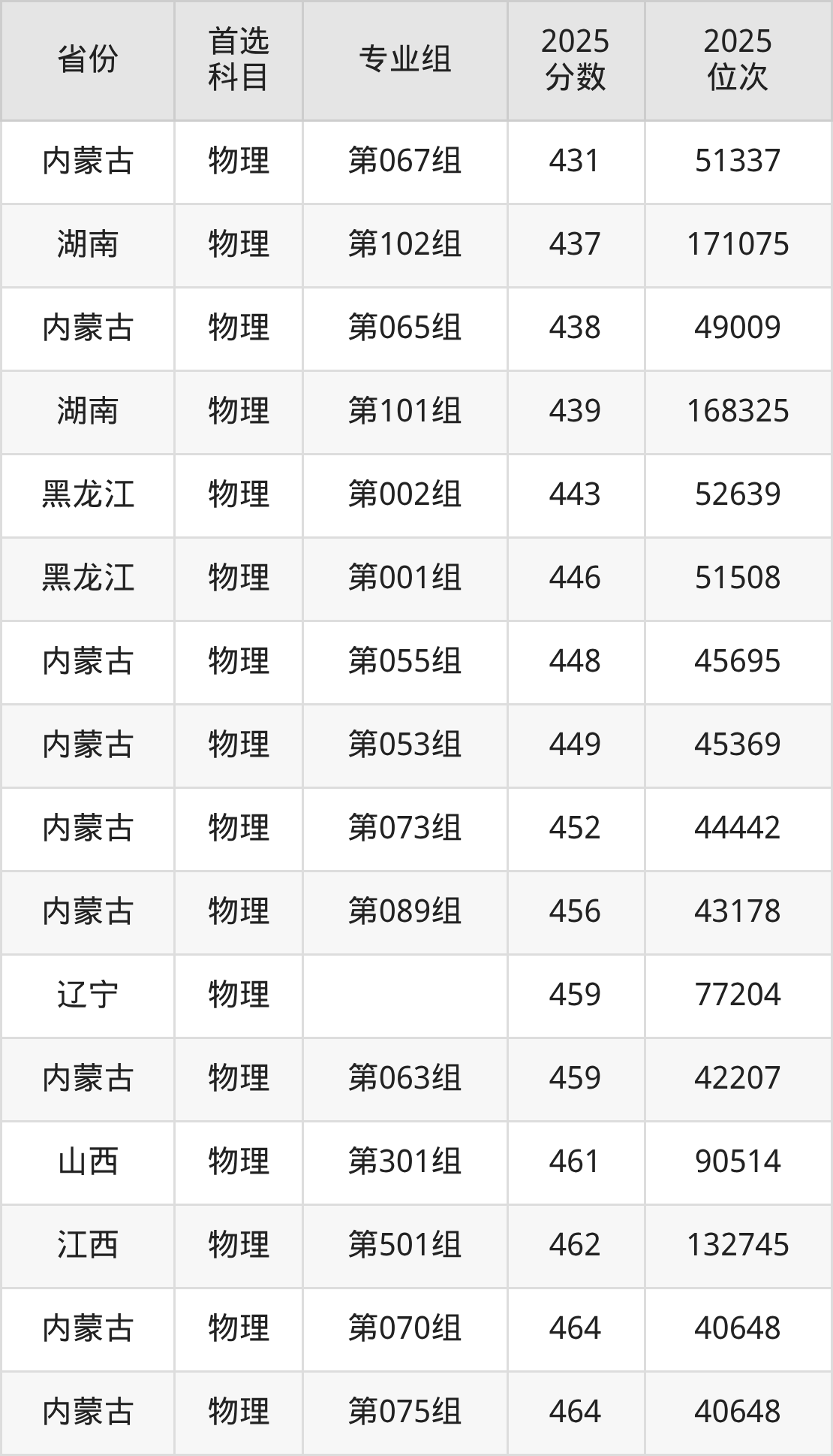 物理类:第049组495分、31221名,第050组471分、38447名,第051组425分、53326名,第052组482分、35112名,第053组449分、45369名,第054组430分、51685名,第055组448分、45695名,第056组414分、56914名,第057组418分、55623名,第058组489分、33044名,第059组424分、53661名,第061组419分、55303名,第062组473分、37836名,第063组459分、42207名,第064组428分、52332名,第065组438分、49009名,第066组420分、54937名,第067组431分、51337名,第068组416分、56271名,第070组464分、40648名,第071组508分、27496名,第072组526分、22442名,第073组452分、44442名,第074组493分、31838名,第075组464分、40648名,第076组421分、54593名,第082组483分、34836名,第085组414分、56914名,第086组396分、62560名,第089组456分、43178名,第090组403分、60309名,第091组401分、60964名,第092组423分、53969名;