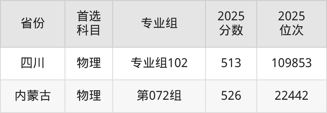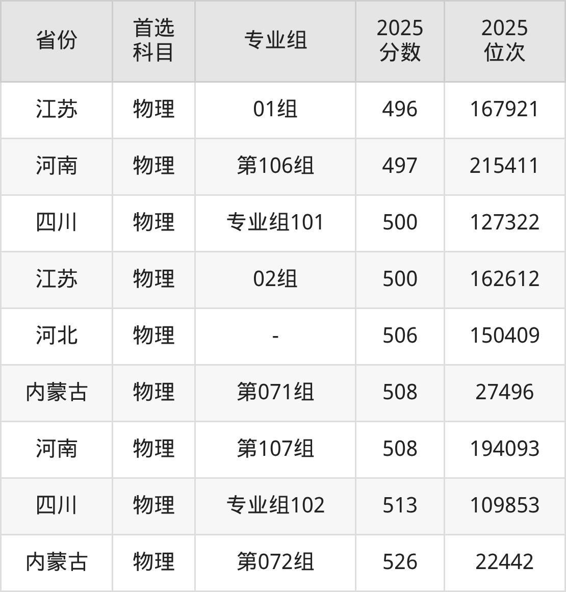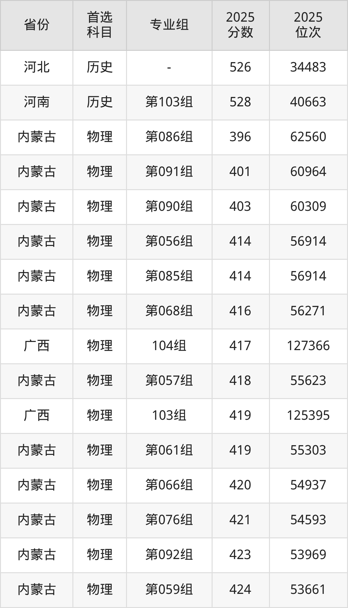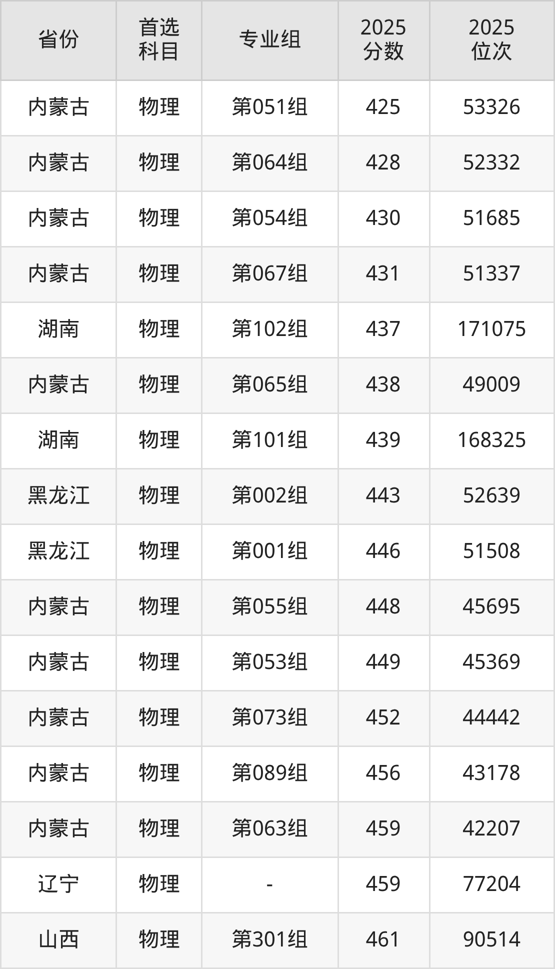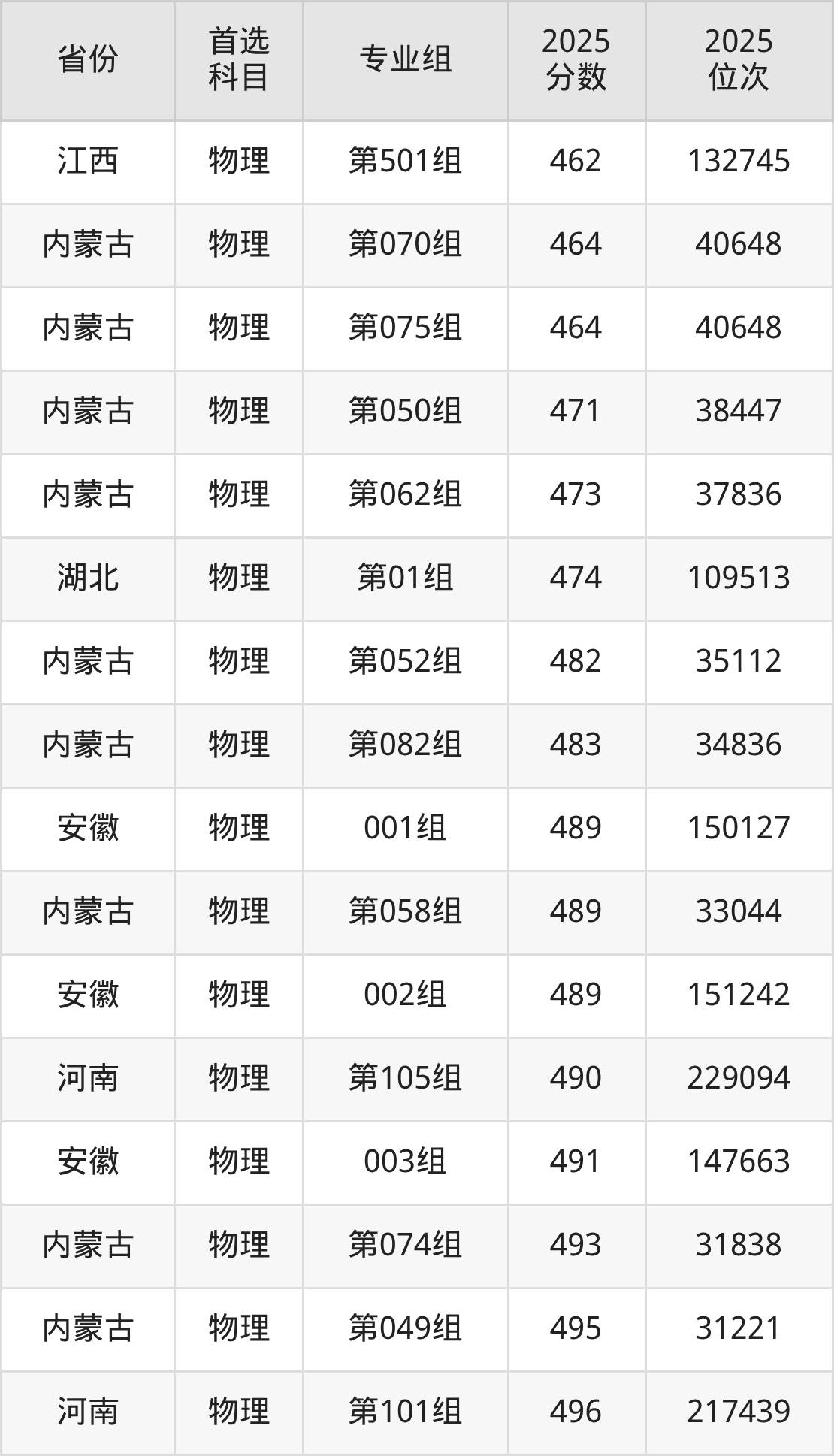 物理类最低分对应地区为内蒙古(第086组),录取位次为62560,超本科线21分;最高分对应地区为内蒙古(第072组),录取位次为22442,超本科线151分。