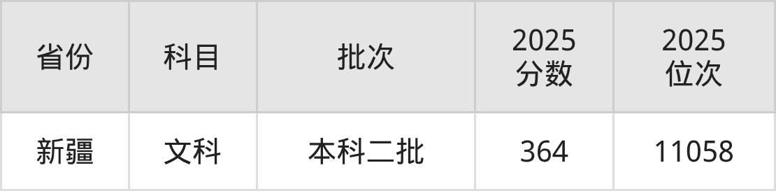 文科最低分对应地区为新疆,录取位次为11058,超二本线34分。