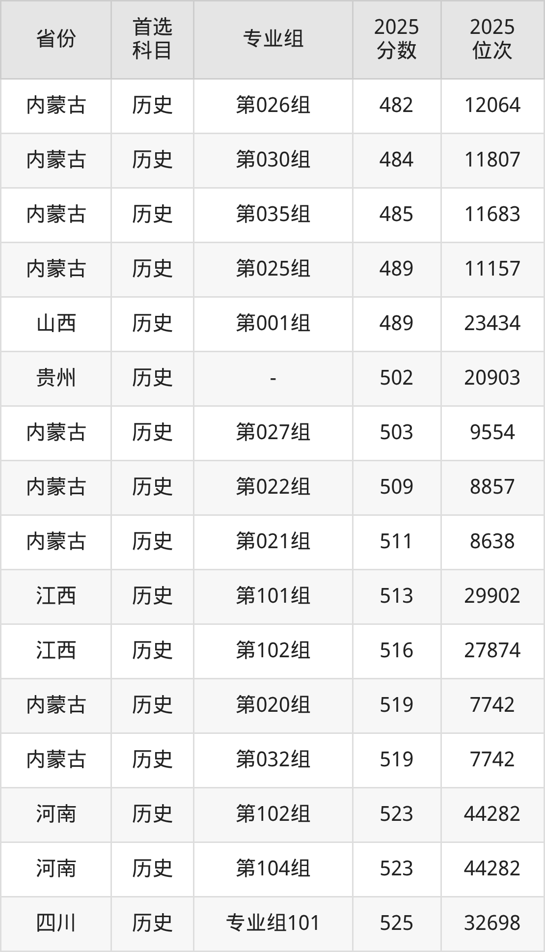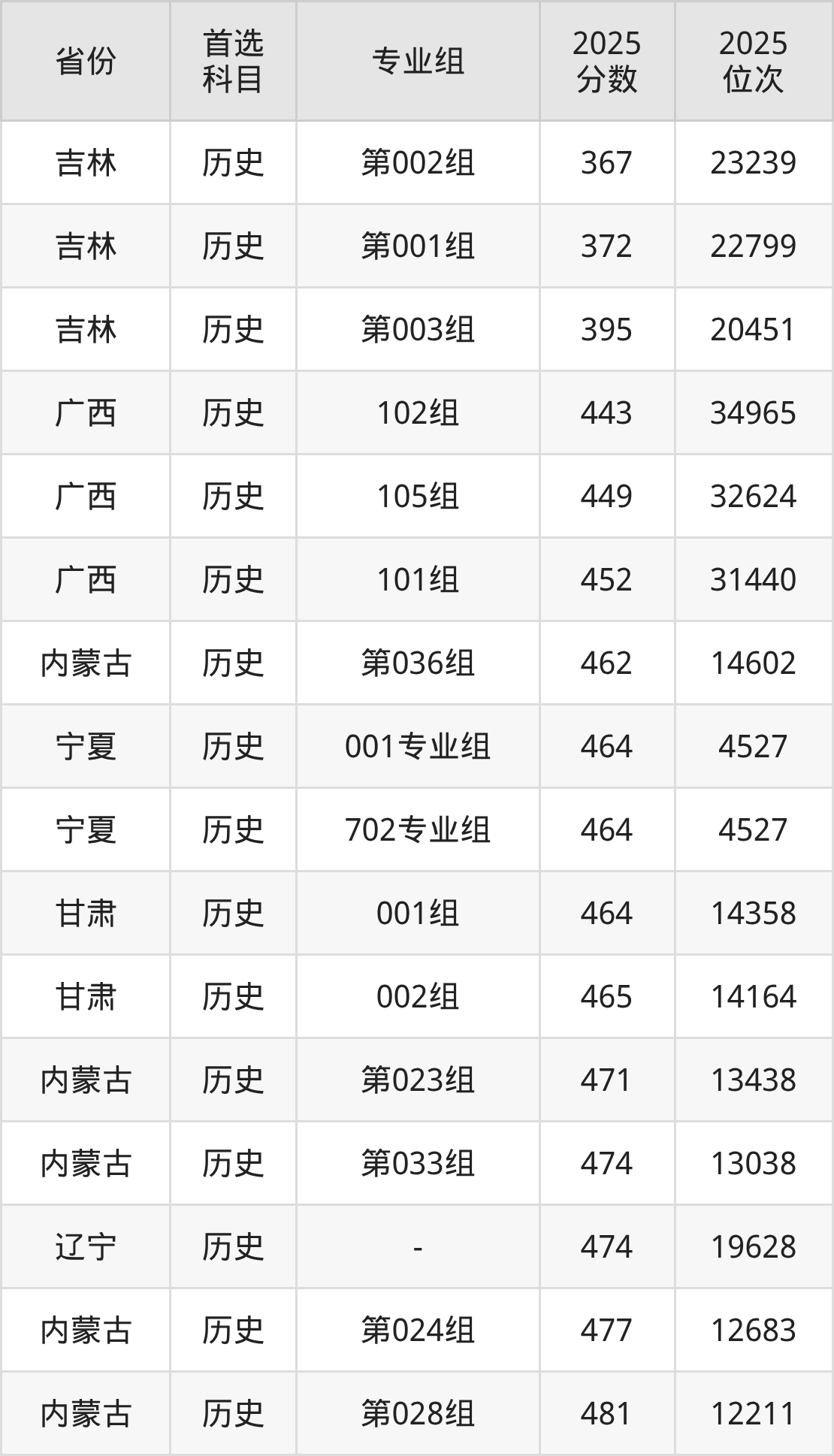 历史类最低分对应地区为吉林(第002组),录取位次为23239,低本科线17分;最高分对应地区为河南(第103组),录取位次为40663,超本科线57分。