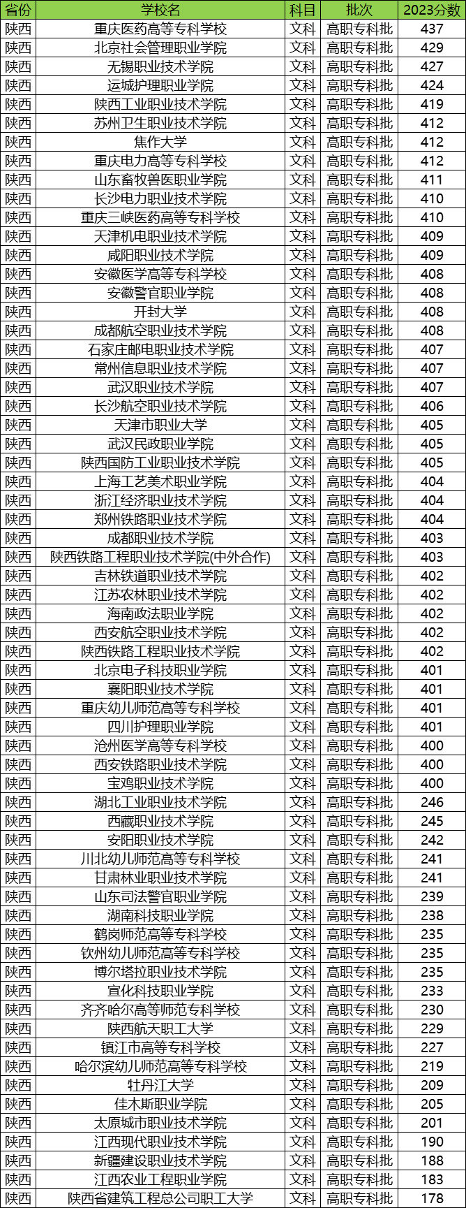 2023年各公办专科大学在陕西文科的录取分数线在178分-437分之间,录取分数在419分以上的公办专科大学有5所,分别是重庆医药高等专科学校(437分)、北京社会管理职业学院(429分)、无锡职业技术学院(427分)、运城护理职业学院(424分)、陕西工业职业技术学院(419分)。