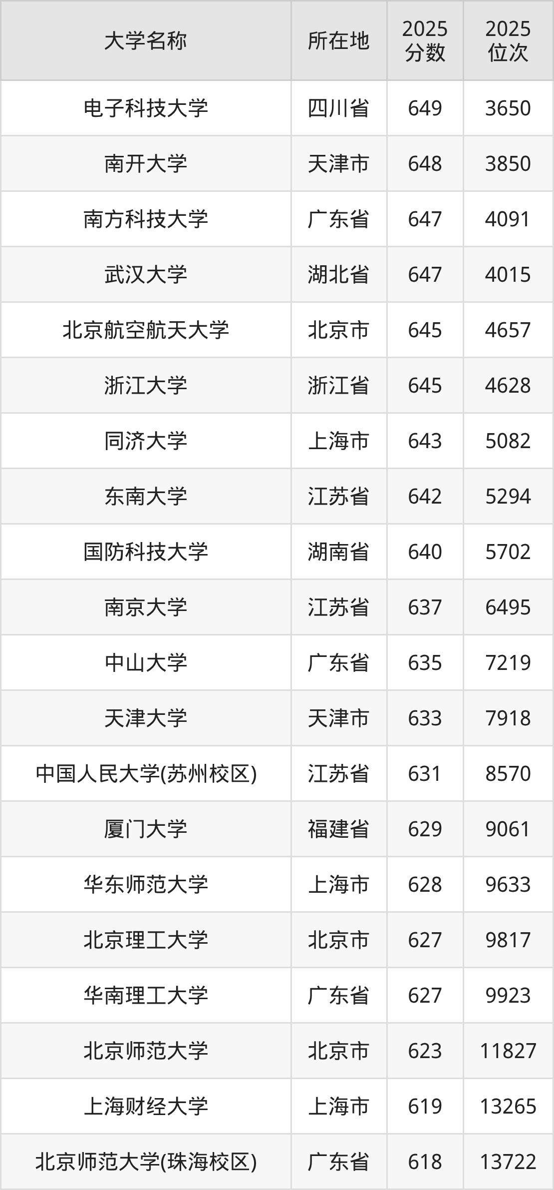 2026年山东高考排名全省7000名左右能上的大学包含:电子科技大学、南开大学、南方科技大学、武汉大学、北京航空航天大学等。