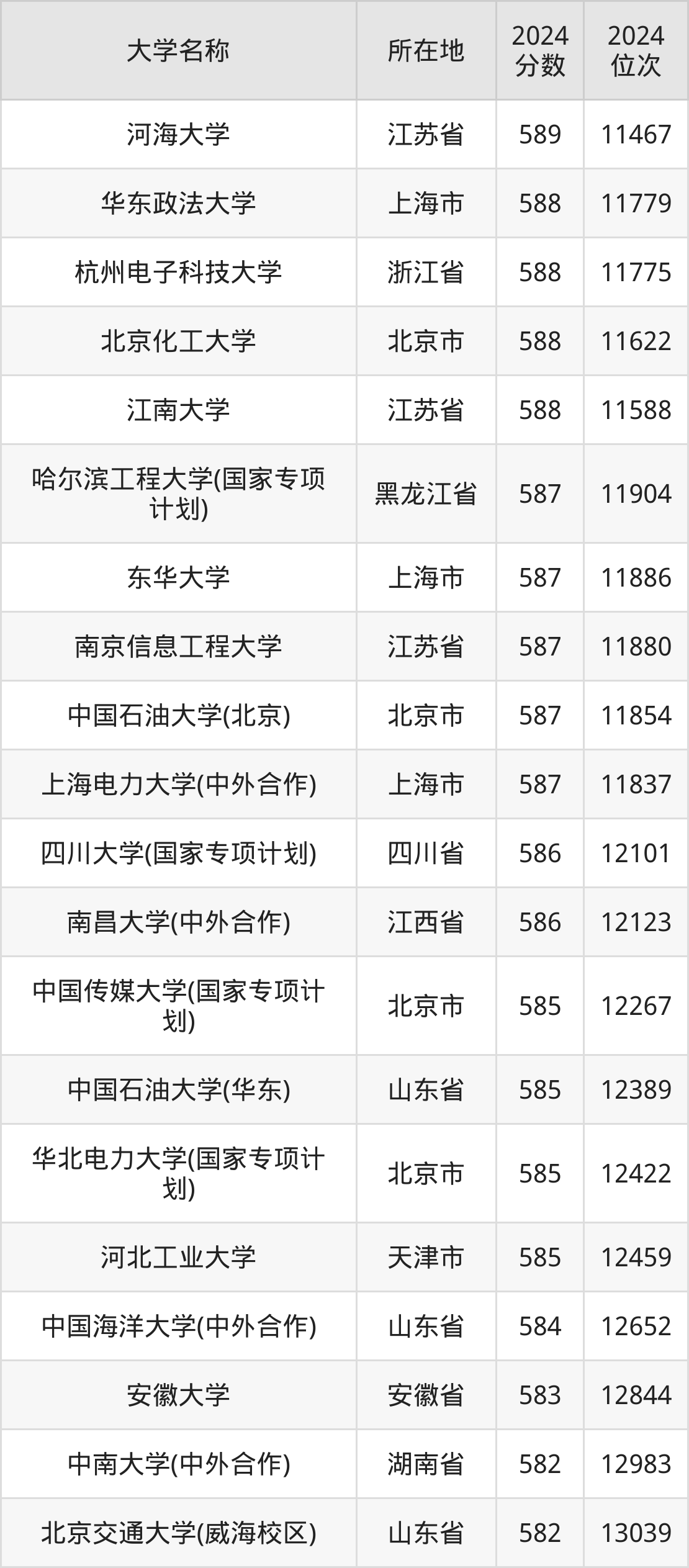 有11所分布在江苏、上海、浙江、北京等报考热门地区,具体包含:河海大学、华东政法大学、杭州电子科技大学、北京化工大学、江南大学、东华大学、南京信息工程大学、中国石油大学(北京)、上海电力大学(中外合作)、中国传媒大学(国家专项计划)、华北电力大学(国家专项计划)。