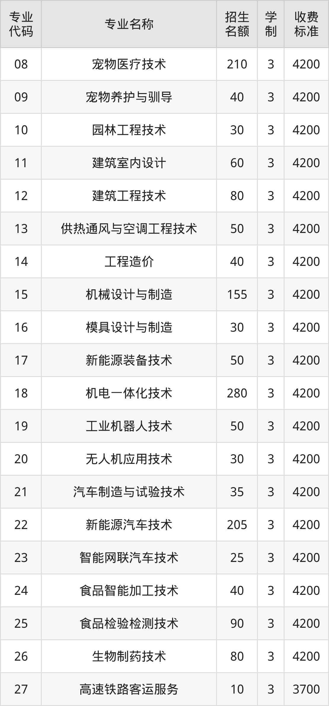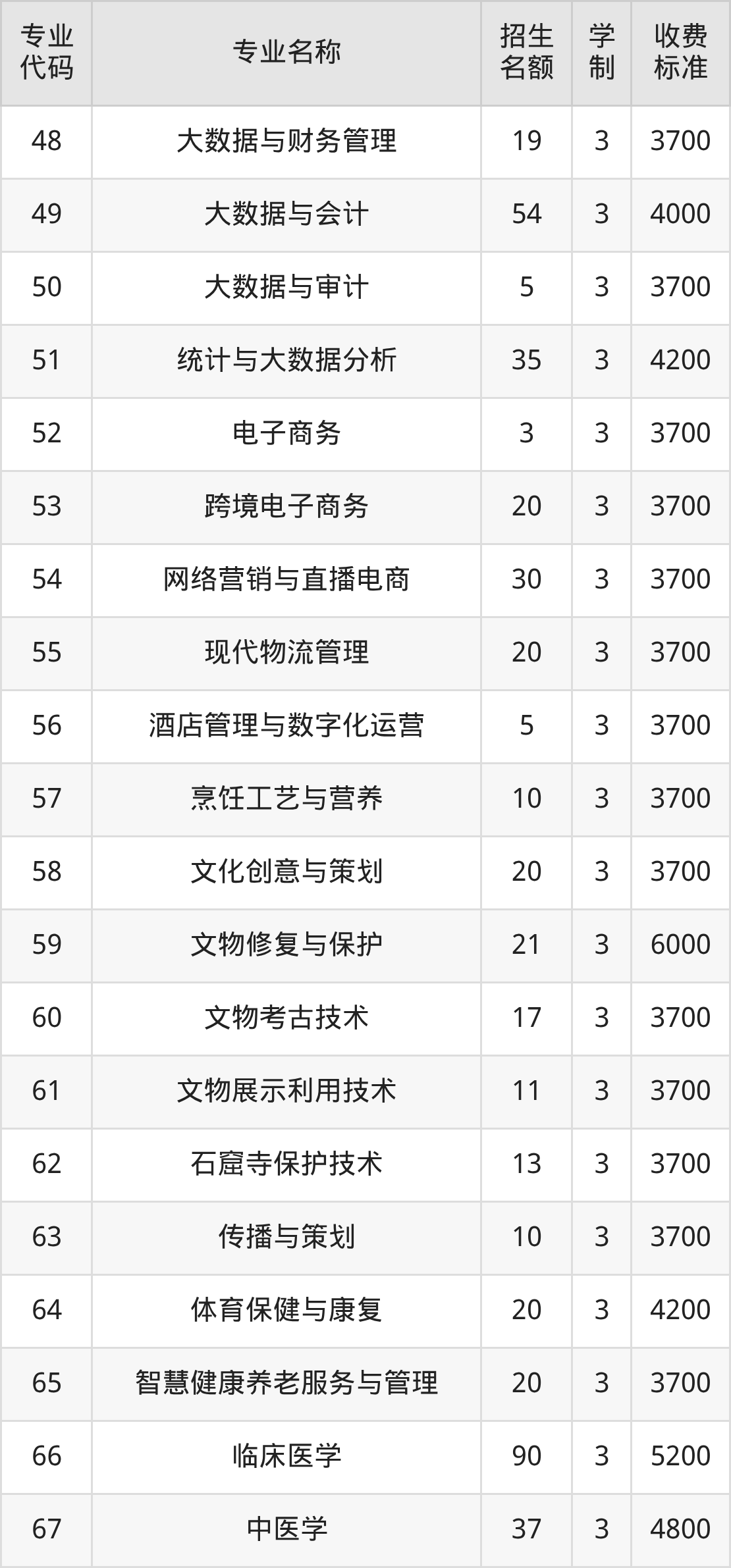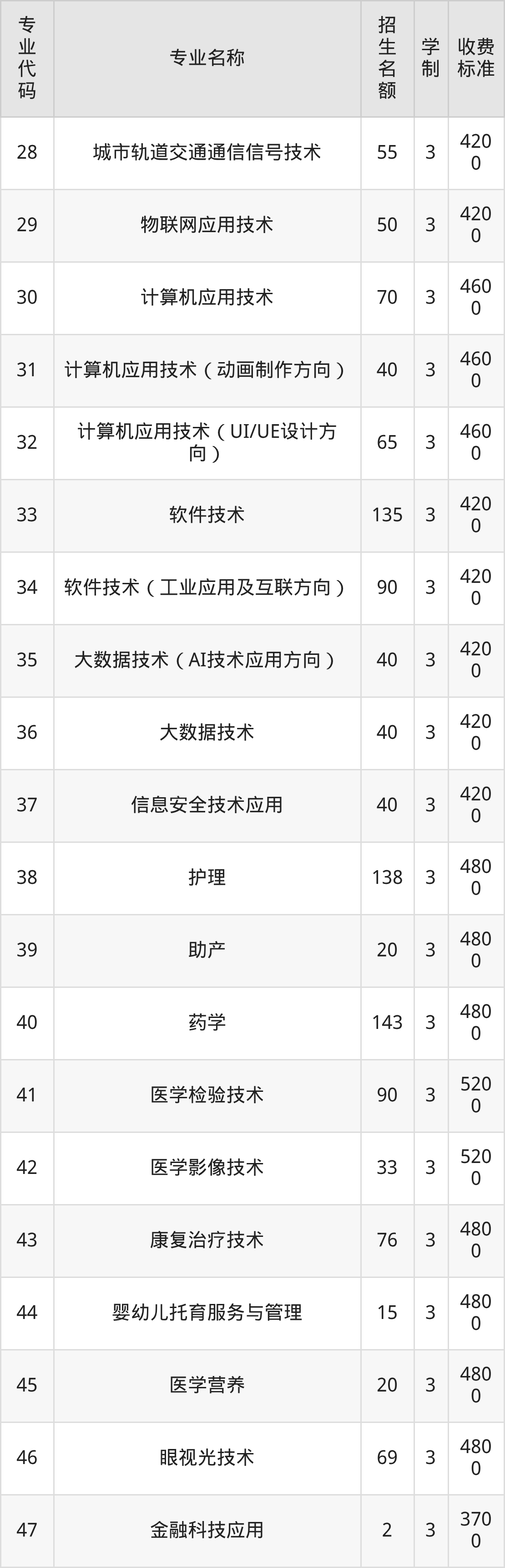 | 专业 代码 | 专业名称 | 招生 名额 | 学 制 | 收费 标准 |