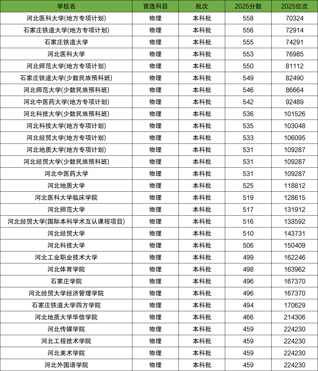 2025年石家庄本科各大学中,在物理类分数线最高、最难考的院校是河北医科大学(地方专项计划),2025年录取分数558分,录取位次70324位;