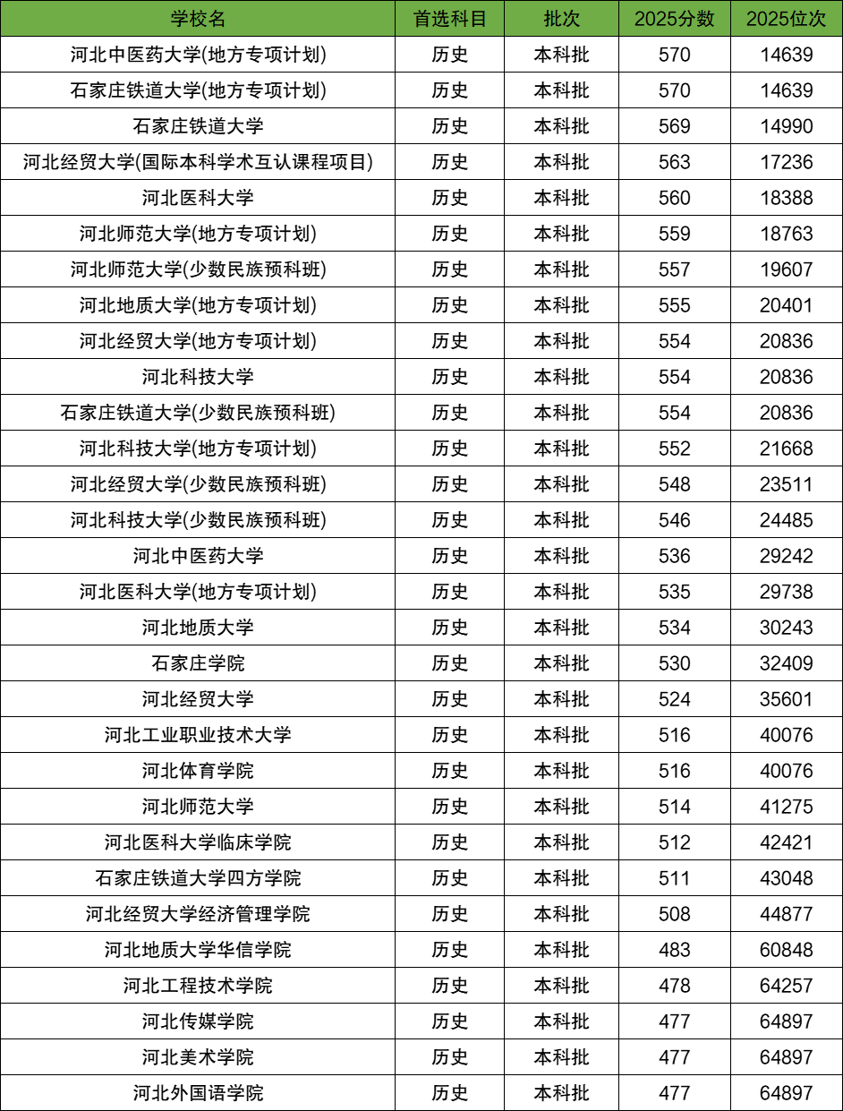 2025年石家庄本科各大学中,在历史类分数线最高、最难考的院校是河北中医药大学(地方专项计划),2025年录取分数570分,录取位次14639位;
