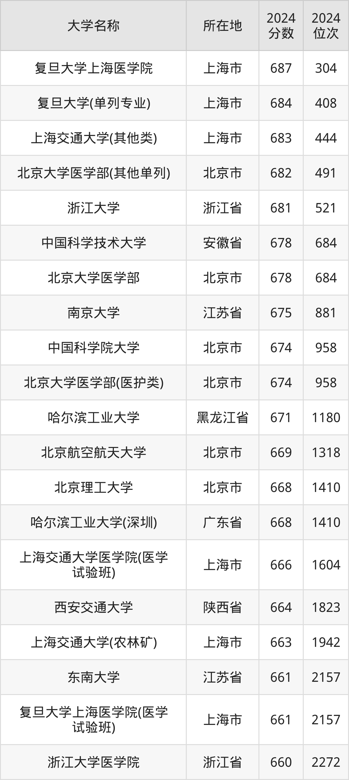 有17所分布在上海、北京、浙江、江苏、广东等报考热门地区,具体包含:复旦大学上海医学院、复旦大学(单列专业)、上海交通大学(其他类)、北京大学医学部(其他单列)、浙江大学、北京大学医学部、南京大学、中国科学院大学、北京大学医学部(医护类)、北京航空航天大学、北京理工大学、哈尔滨工业大学(深圳)、上海交通大学医学院(医学试验班)、上海交通大学(农林矿)、东南大学、复旦大学上海医学院(医学试验班)、浙江大学医学院。