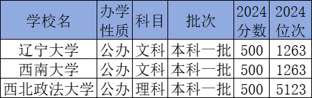 文科500分能上的大学有辽宁大学、西南大学;理科500分能上的大学有西北政法大学。