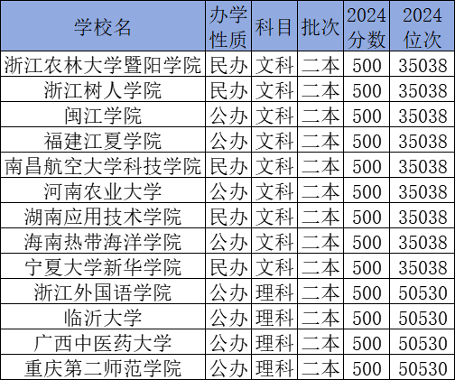 文科500分能上的大学有浙江农林大学暨阳学院、浙江树人学院、闽江学院等;理科500分能上的大学有浙江外国语学院、临沂大学、广西中医药大学、重庆第二师范学院。