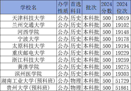 历史类500分能上的有天津科技大学、兰州交通大学、河西学院、宁波大学、太原科技大学等;物理类500分能上的有湖南工业大学(预科班)、贵州大学(预科班)。