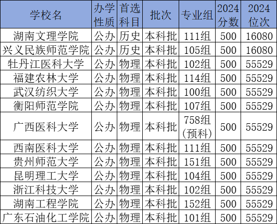 历史类500分能上的有湖南文理学院、兴义民族师范学院;物理类500分能上的有牡丹江医科大学、福建农林大学、武汉纺织大学、衡阳师范学院等。