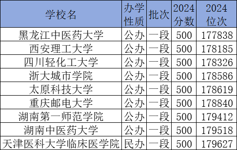 500分能上的大学中公办的有黑龙江中医药大学、西安理工大学、四川轻化工大学等,民办的有天津医科大学临床医学院。