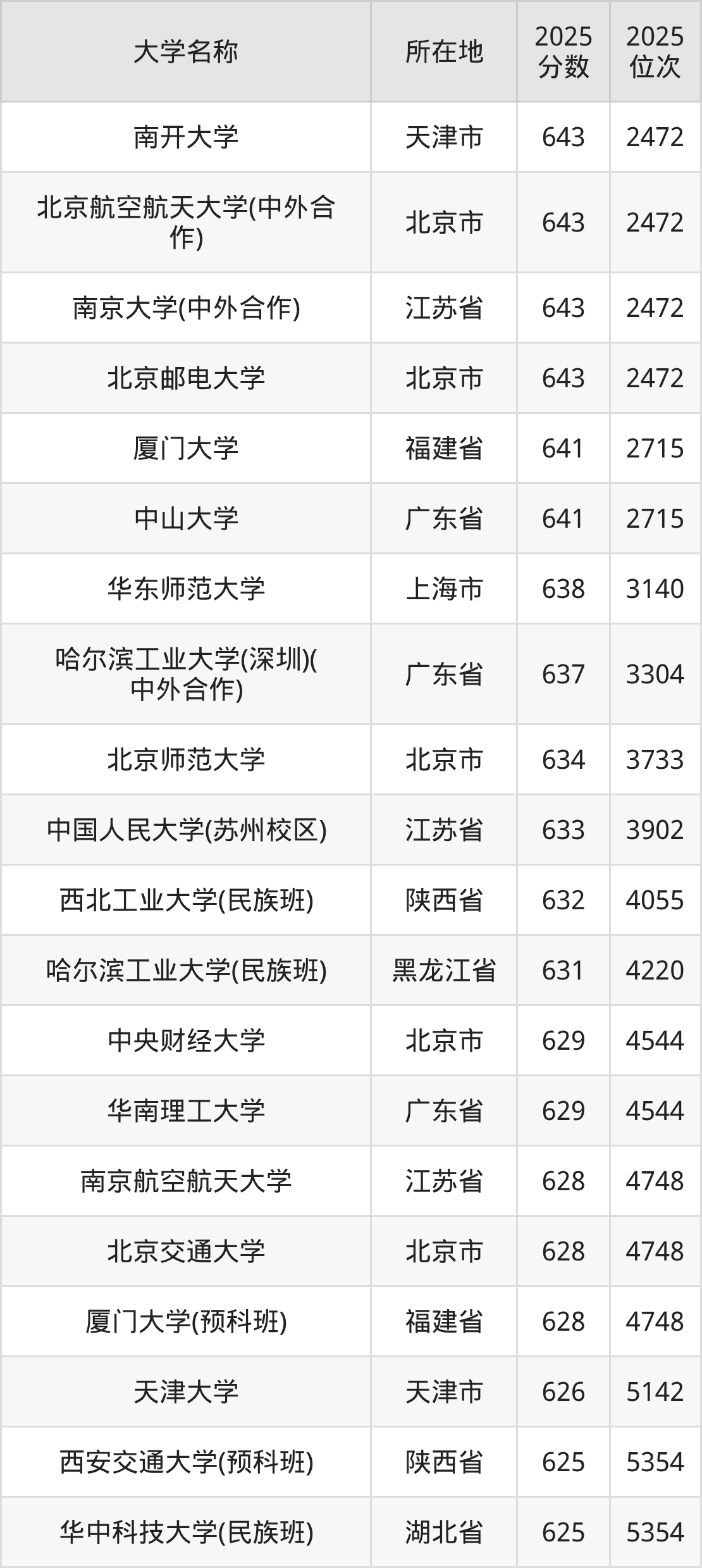 有12所分布在北京、江苏、广东、上海等报考热门地区,具体包含:北京航空航天大学(中外合作)、南京大学(中外合作)、北京邮电大学、中山大学、华东师范大学、哈尔滨工业大学(深圳)(中外合作)、北京师范大学、中国人民大学(苏州校区)、中央财经大学、华南理工大学、南京航空航天大学、北京交通大学。