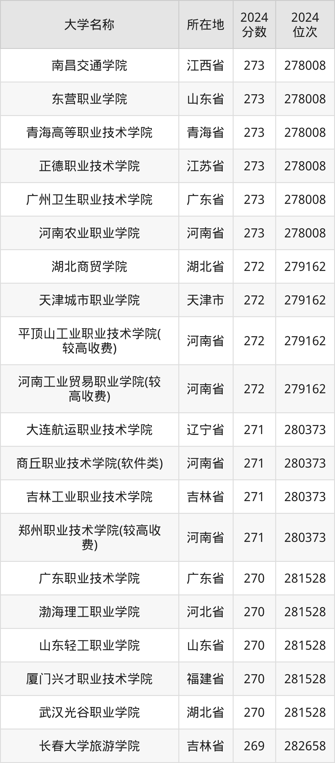 河南高考文科最低位次在280000名附近的大学中,其中有5所位于河南省内,分别为:河南农业职业学院、平顶山工业职业技术学院(较高收费)、河南工业贸易职业学院(较高收费)、商丘职业技术学院(软件类)、郑州职业技术学院(较高收费)。