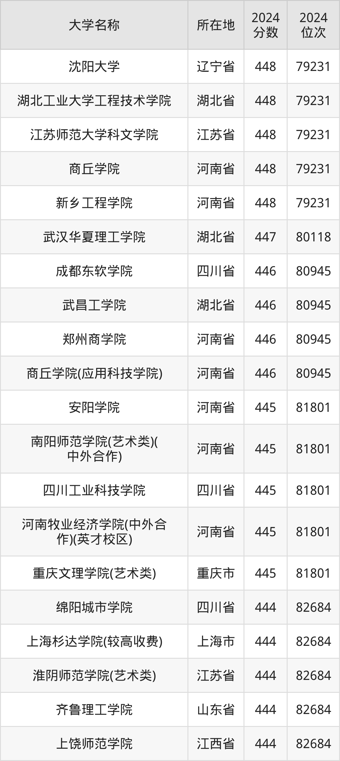 河南高考文科最低位次在81000名附近的大学中,其中有7所位于河南省内,分别为:商丘学院、新乡工程学院、郑州商学院、商丘学院(应用科技学院)、安阳学院、南阳师范学院(艺术类)(中外合作)、河南牧业经济学院(中外合作)(英才校区)。