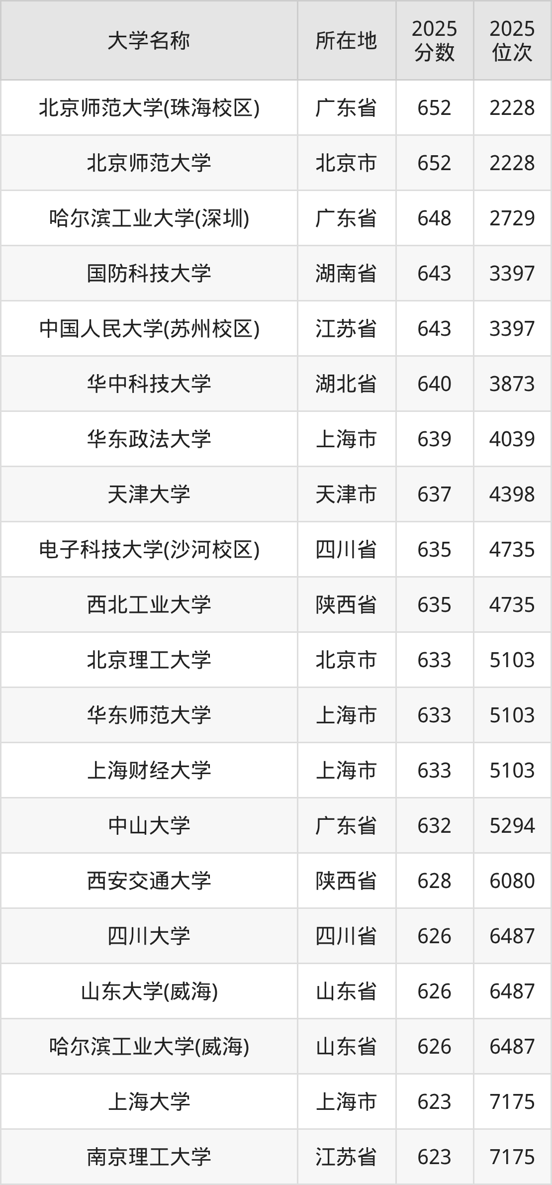 有11所分布在广东、北京、江苏、上海等报考热门地区,具体包含:北京师范大学(珠海校区)、北京师范大学、哈尔滨工业大学(深圳)、中国人民大学(苏州校区)、华东政法大学、北京理工大学、华东师范大学、上海财经大学、中山大学、上海大学、南京理工大学。