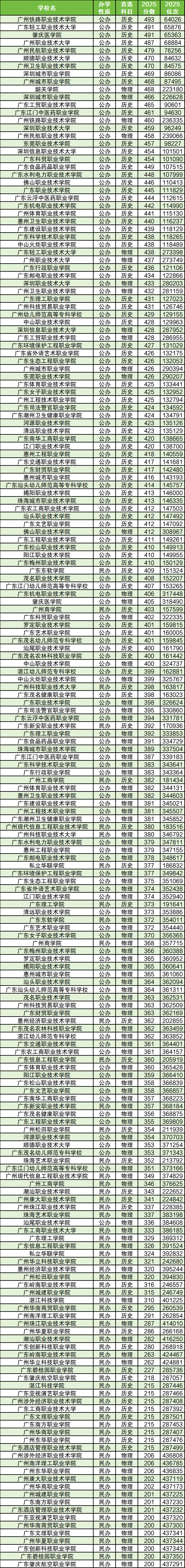 参考2025年广东录取数据,广东历史组专科各大学录取分数线最高的是:广州铁路职业技术学院,2025年最低分数线是493分,位次排名是64026位。